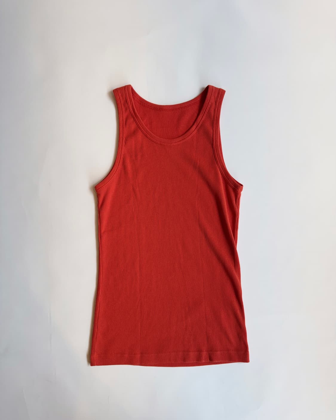 밝은 오렌지 컬러 포인트가 되는 골지 소재의 슬리브리스 탑입니다. 신축성이 좋은 쫀쫀한 소재로 체형에 맞게 슬림한 핏을 연출해 줍니다. Condition : A