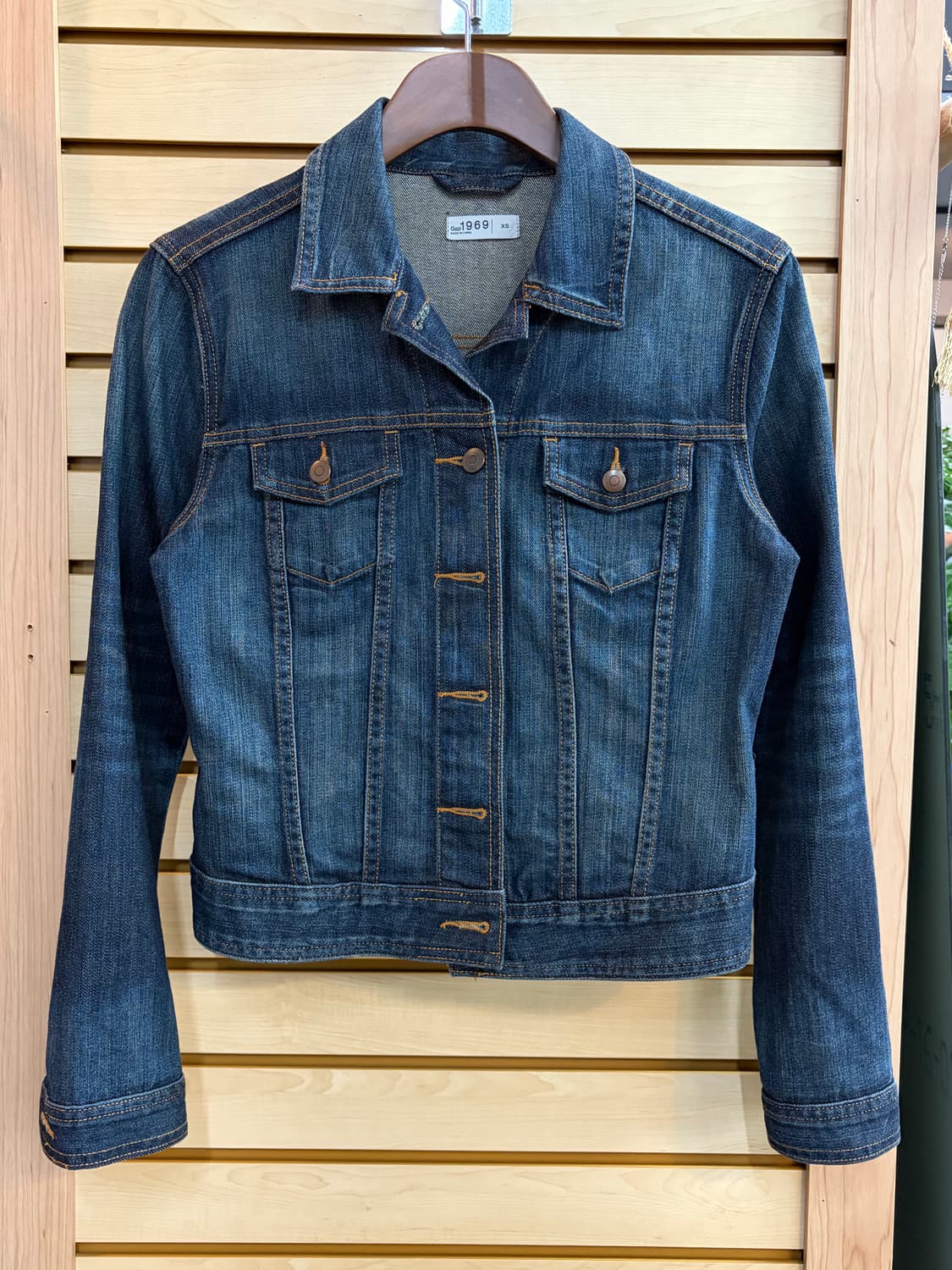 갭 1969 데님 자켓! 빈티지 워싱이 멋스럽고, 생지 데님 특유의 질감이 살아있어요! 사이즈는 XS 어깨 42 가슴44 소매60 총장53 컨디션 좋아요! 구매원하시면 공지 확인 후 바로 안전결제 부탁드려요! :)