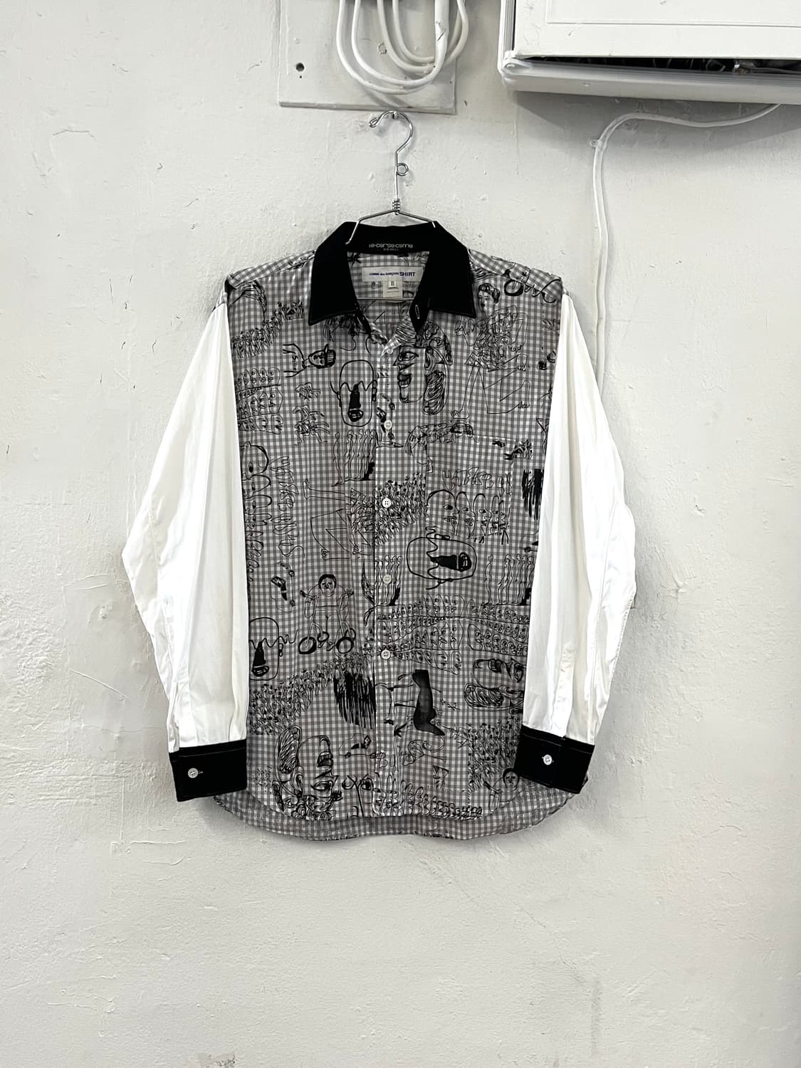 COMME DES GARCONS SHIRT MADE IN FRANCE 꼼데가르송의 최고급라인 셔츠 라인에서 2016SS 아트 컬렉션으로 발매된 셔츠 제품 입니다 각종 낙서와 같은 키치한 그림들이 예술적으로 표현 되어 있는 제품으로, 울 배색감을 통한 질감과 컬러감이 매력적인 제품 입니다 프랑스 생산을 주로 하는 꼼데가르송 셔츠라인 답게 사이즈가 크면서도 우아하며, 꼼데가르송 특유의 제품 매력적인 착용 실루엣이 돋보이는 제품 입니다 size: xs (어깨 46 가슴 52 총장 71 소매 60) 남성 M 정도의 사이즈감 condition: 9/10 (오염 및 결함 없는 상태의 제품)