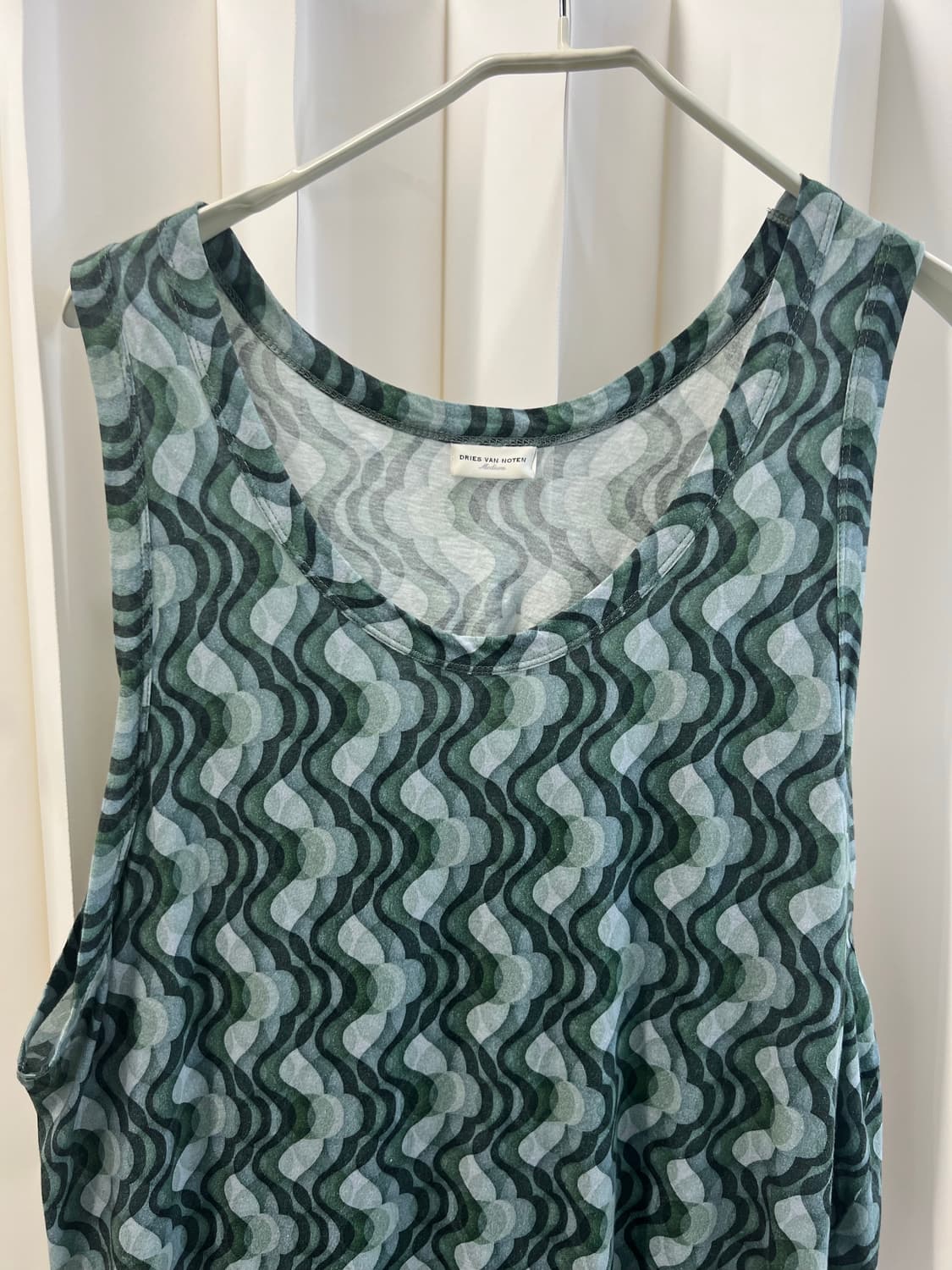 드리스반노튼의 그린 패턴 나시입니다 사이즈는 M이며, 독특한 패턴이 매력적인 제품이에요 사진에서 보이는 것처럼 부드러운 소재로 편안하게 착용 가능해요 여름철 시원하게 입기 좋은 아이템이랍니다 레이어링 용으로도 추천드립니다!