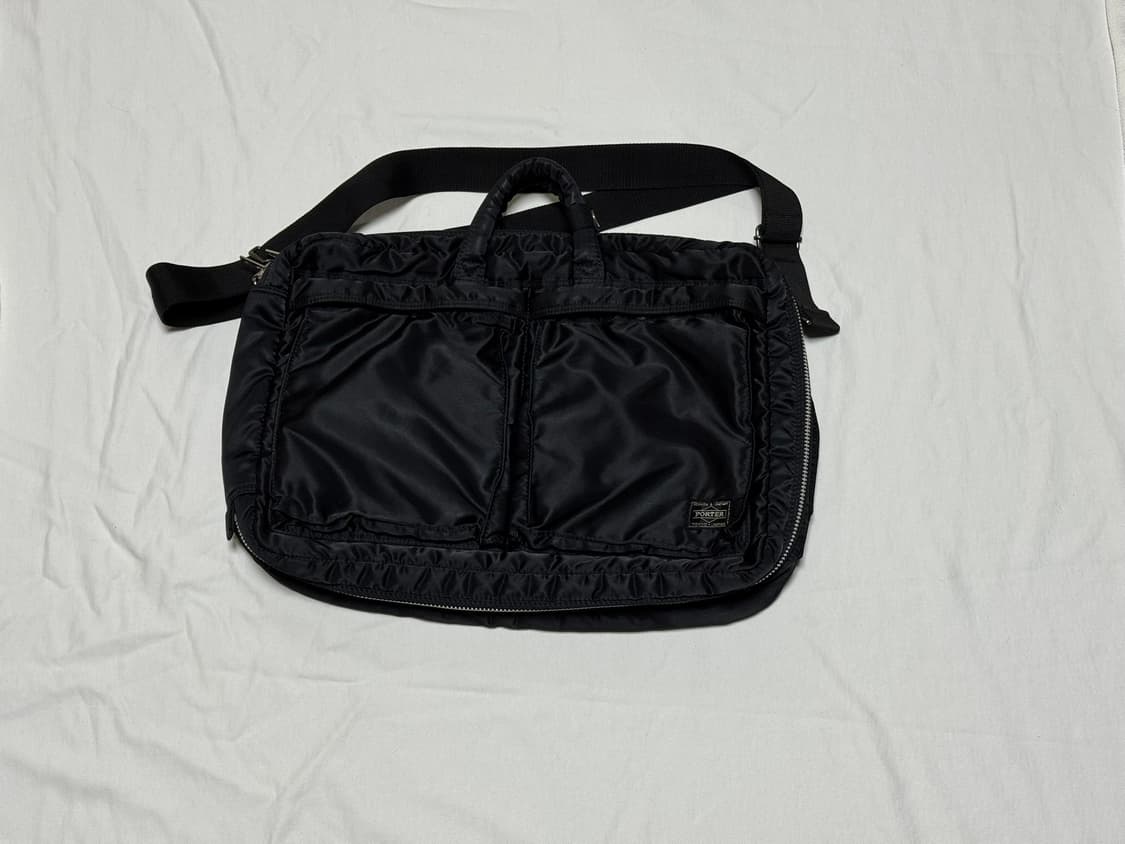 포터(PORTER) 탱커 3WAY 브리프케이스 — 블랙 도쿄의 장인 요시다 가방(Yoshida & Company)이 빚어낸 탱커 시리즈는, 단순한 가방이 아닌 하나의 태도입니다. 미 공군의 비행 재킷 'MA-1'에서 영감을 받아 탄생한 이 가방은, 유행이라는 계절의 변덕을 초월하여 묵묵히 제 자리를 지켜왔습니다. 브리프케이스로, 숄더백으로, 백팩으로—세 가지 얼굴을 가진 이 동반자는, 도시의 리듬 속에서 당신의 가장 솔직하고 믿음직한 짐꾼이 되어 줄 것입니다. Detail Design: 전면의 대형 이중 포켓과 상단 핸들, 탈착식 숄더 스트랩, 백팩 하네스를 모두 갖춘 정통 3WAY 구조입니다. 어떤 형태로 착용하더라도 가방 본연의 실루엣은 흐트러지지 않으며, 수납 구조의 밀도감은 포터 특유의 일침입혼(一針入魂) 정신이 고스란히 담겨 있습니다. Fabric: 나일론 트윌(표면) + 폴리에스테르 코튼(중간층) + 나일론 타프타(이면)의 3중 오리지널 원단 사용. 세월과 함께 원단 표면에 자연스러운 광택의 변화가 생겨 있으며, 이는 탱커 시리즈가 시간 속에서 쌓아온 흔적으로 읽힐 수 있습니다. 안감의 레스큐 오렌지는 생동감을 잃지 않고 선명함을 유지하고 있습니다. Condition: 전면 좌측 벨크로 일부 손상이 있으며, 크로스 숄더 스트랩은 대체품으로 교체되어 있습니다. 내부 오염은 없으며, 투명 PVC 내부 포켓 및 오렌지 안감 상태 양호합니다. 지퍼 및 스냅 버튼 등 부자재 작동 정상. 전체적으로 연식에 따른 자연스러운 에이징이 있는 B급 우수 컨디션입니다. Size (단면 실측 / cm) 가로: 39 세로: 31 넓이: 8
