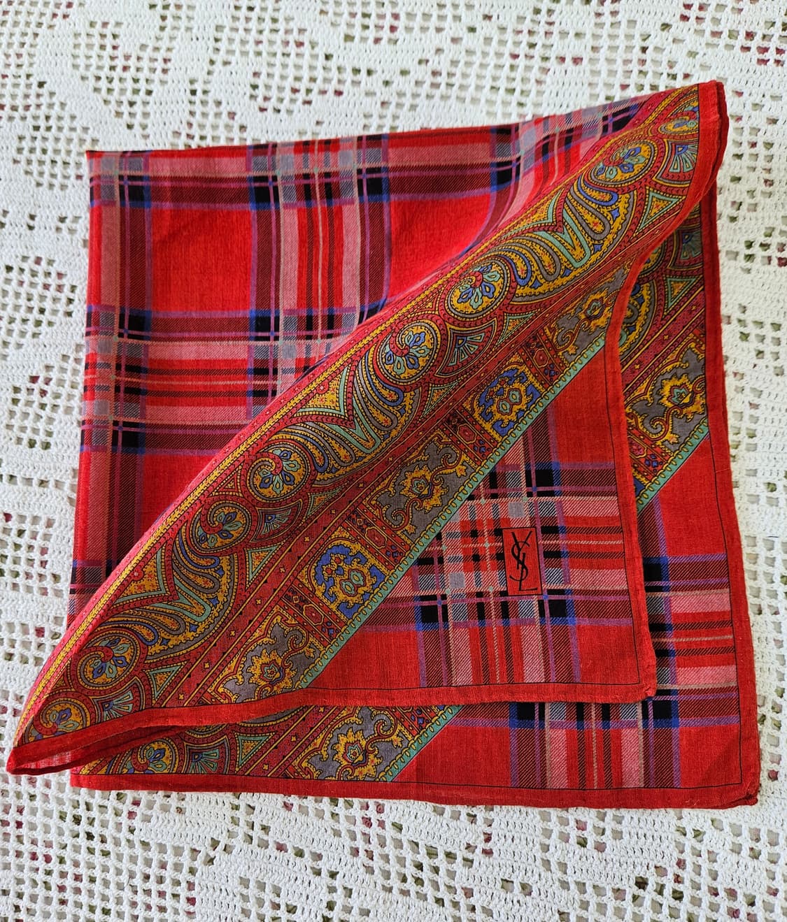 YSL 입생로랑 로고 스타일 체크 페이즐리 손수건 레드 체크 바탕에 페이즐리 보더가 더해진 클래식한 디자인으로, 빈티지 무드가 확실한 제품입니다. 코너 로고 포인트까지 들어가 있어 손수건으로는 물론 가벼운 연출용으로도 예뻐요. 사이즈: 45×46 소재: 면 체크와 페이즐리 조합이 고급스럽고 포인트 주기 좋은 빈티지 아이템입니다. 단독 세탁 또는 드라이클리닝 권장드립니다
