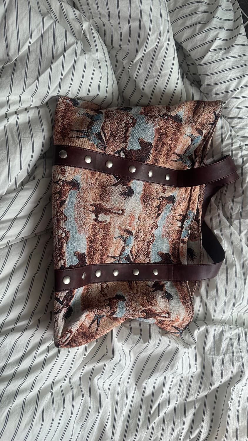 유니크한 말 패턴이 돋보이는 케미컬 스포츠 토트백입니다. 브라운 색상의 가죽 스트랩이 포인트로 들어가 있습니다. 빅 사이즈라 수납력도 좋습니다. 별도 문의 없으시면 바로 안전결제 부탁드려요!