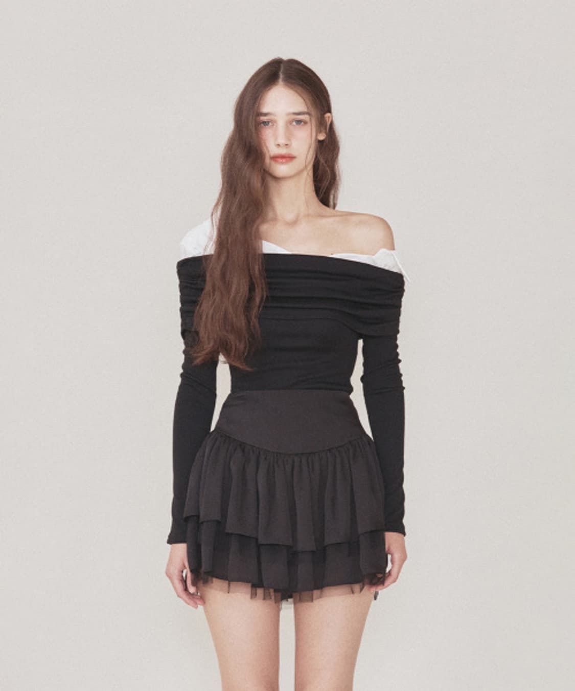 • 쓰리타임즈 벨 셔링 탑 오프숄더 그레이
