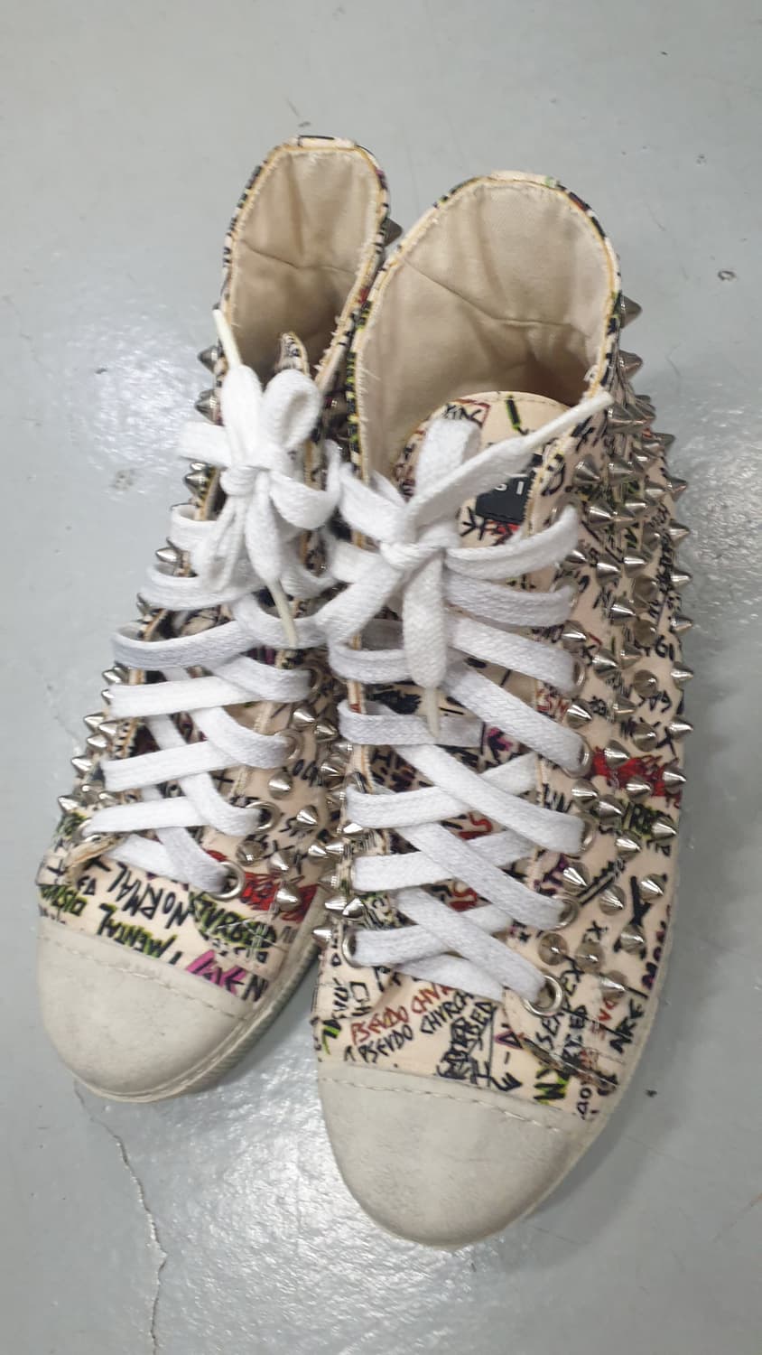 독특한 그래피티 패턴과 스터드 장식이 돋보이는 젠치 하이탑 스니커즈예요 스페인에서 제작되었으며 사이즈는 38입니다 유니크한 디자인으로 어떤 룩에도 포인트를 줄 수 있어요 개성있는 스타일을 연출하고 싶으신 분들께 추천드려요 상태좋아요 하자없구요 교환 환불 애눌 안됩니다