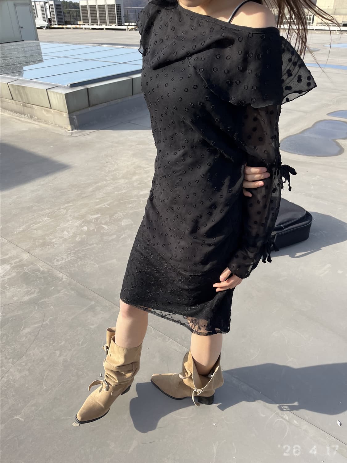 가벼운 시어 소재로 제작된 검은색 블라우스입니다. 넥라인을 따라 잡힌 부드러운 러플 디테일과 소매단의 리본 장식이 사랑스러운 분위기를 더합니다. size: Shoulder:44 Chest:42 Sleeve: 55Length:55 price: 23,900 [set] price: 44,900 *세트 가격은 개별 구매가보다 할인된 가격에 만나보실 수 있습니다. 세트 구매 문의는 인스타그램 DM 또는 후르츠패밀리 메시지 부탁드립니다. 실측 사이즈는 옷걸이에 건 후, 모든 단추를 채운 상태에서 측정합니다. 모든 제품은 다림질 완료하여 배송됩니다.