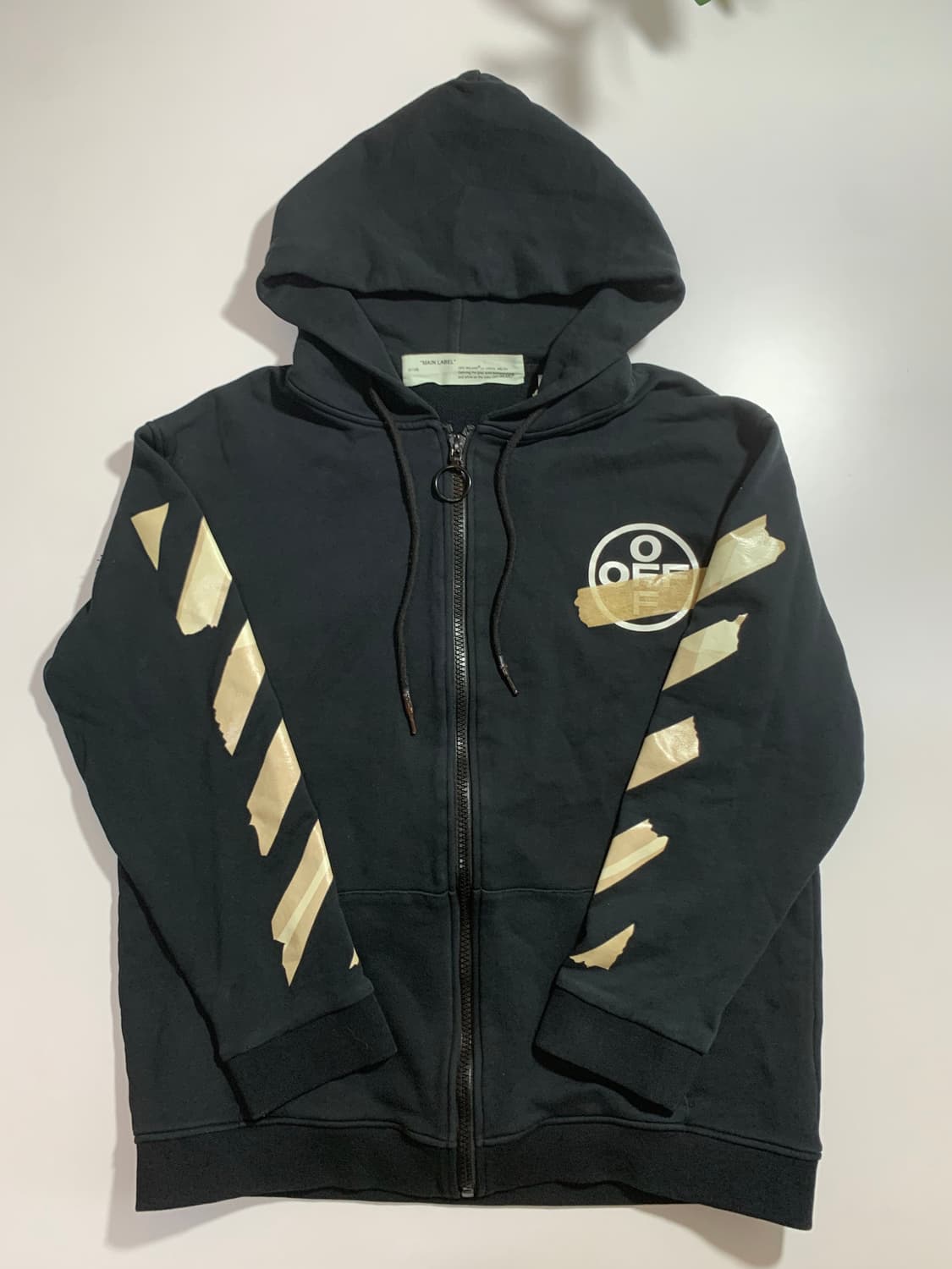 오프화이트 메인 라벨 테이프 애로우 후드집업이에요 100% 코튼 소재로 편안하게 착용 가능해요 사진에서 보이는 것처럼 소매와 앞면에 테이프 애로우 디테일이 포인트랍니다 깔끔한 블랙 색상에 유니크한 디자인으로 어디에나 매치하기 좋아요 -총길이 68 / 가슴단면 60