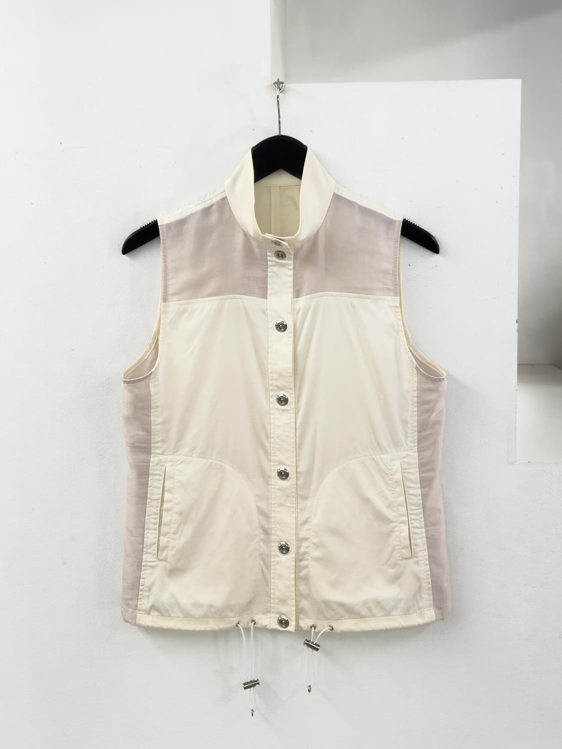 랑방 스포츠의 나일론 베스트 입니다. 유니크한 디자인과 모던한 분위기가 매력적인 제품 입니다. 실측 단면 사이즈 (측정 방식에 따라 1-2cm 오차가 있을 수 있습니다) 표기size 38 어깨34cm 가슴49cm 총장62cm Nylon75% cotton19% poly8%