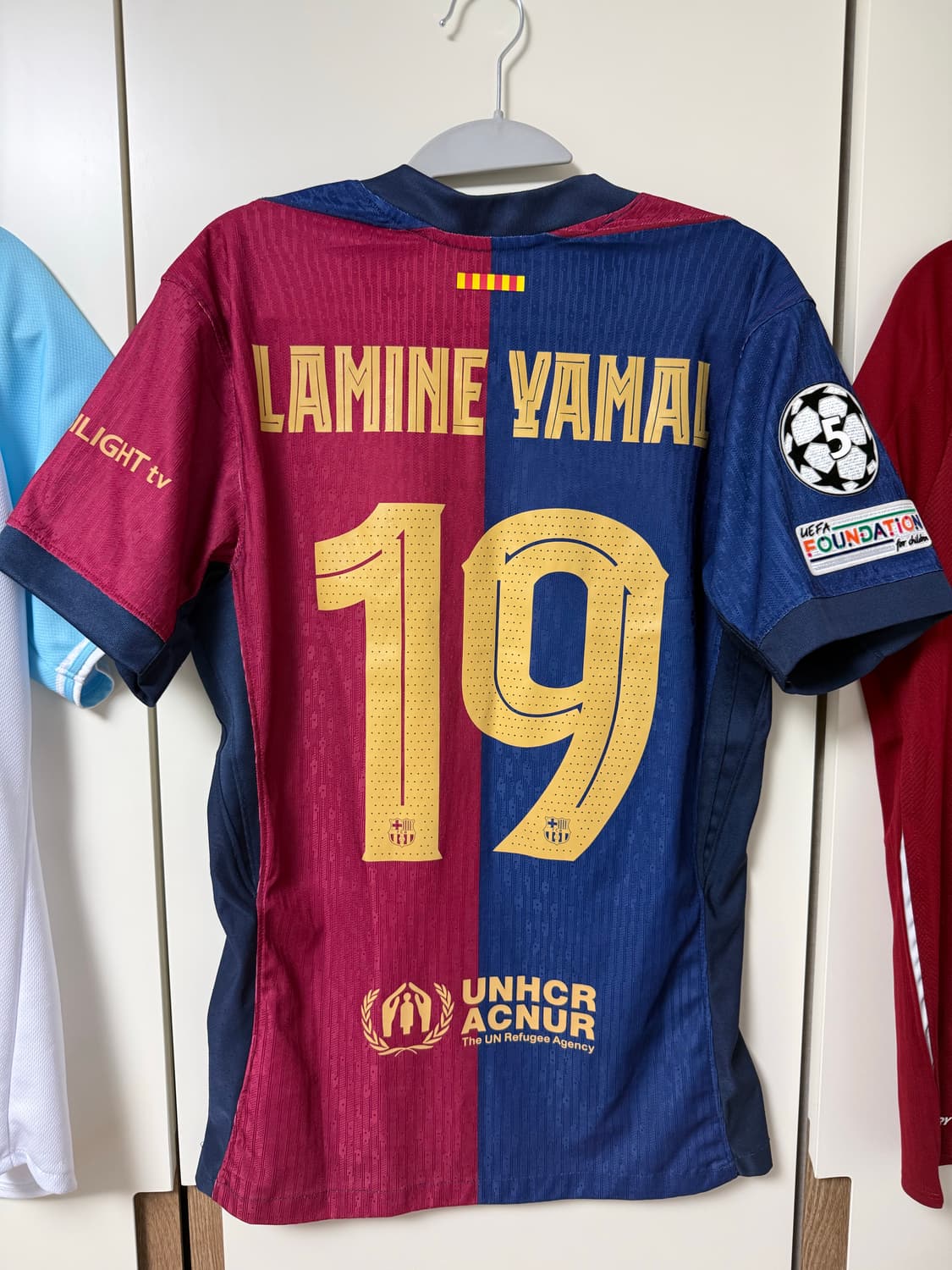 FC바르셀로나 어드밴스 유니폼 S사이즈 판매합니다. 라민 야말 마킹 되어있고, 상태 좋습니다. 24/25시즌 유니폼입니다. 문의 없으시면 바로 안전결제해주시면 됩니다!
