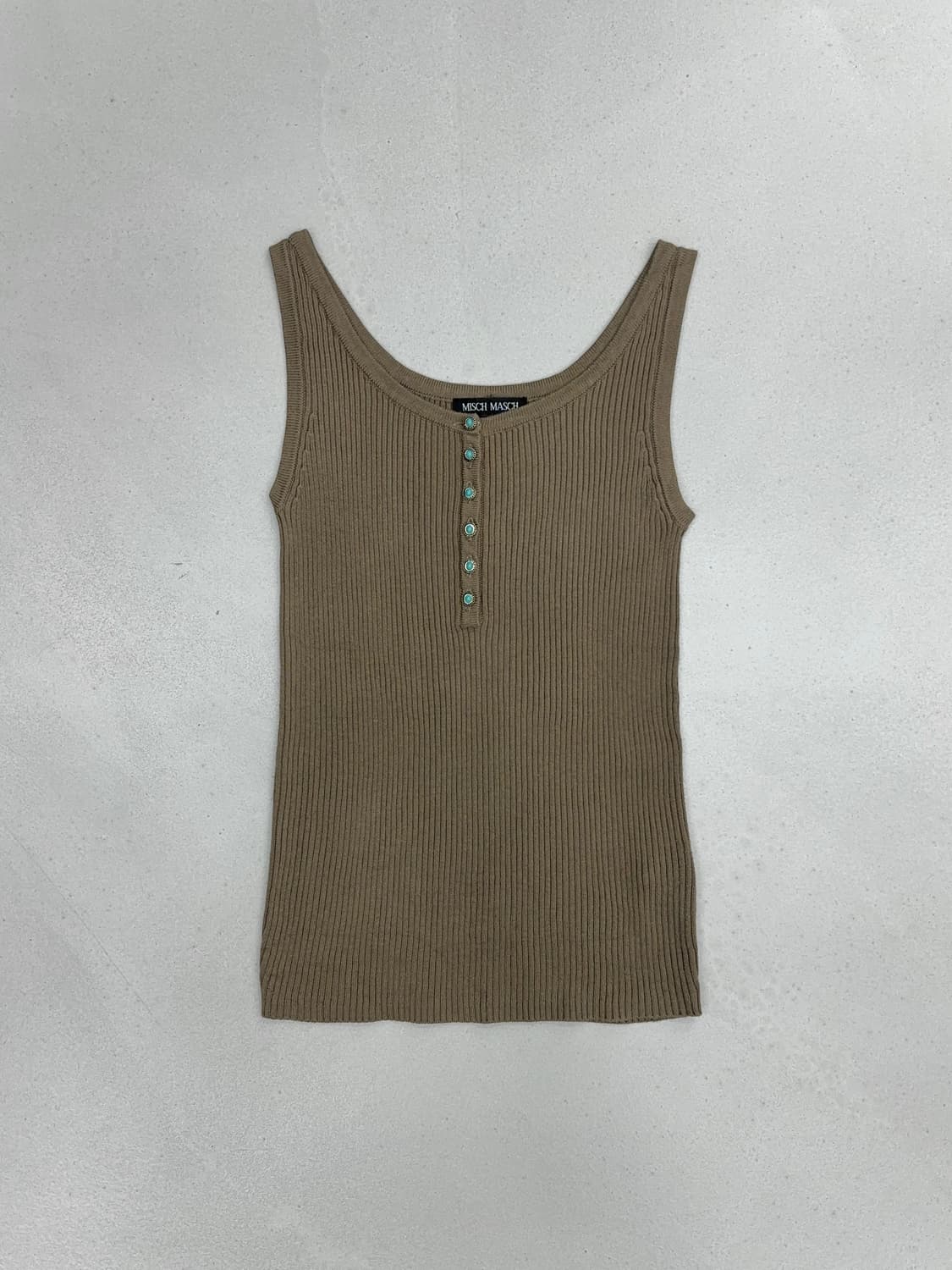 어깨30 가슴30 총장43(cm) MISCH MASCH 슬리브리스 입니다. 코튼50 아크릴50 혼방 소재이며 인디언 쥬얼리 스타일의 버튼 디자인이 특징이네요. 사이즈는 실측을 참고해 주세요!
