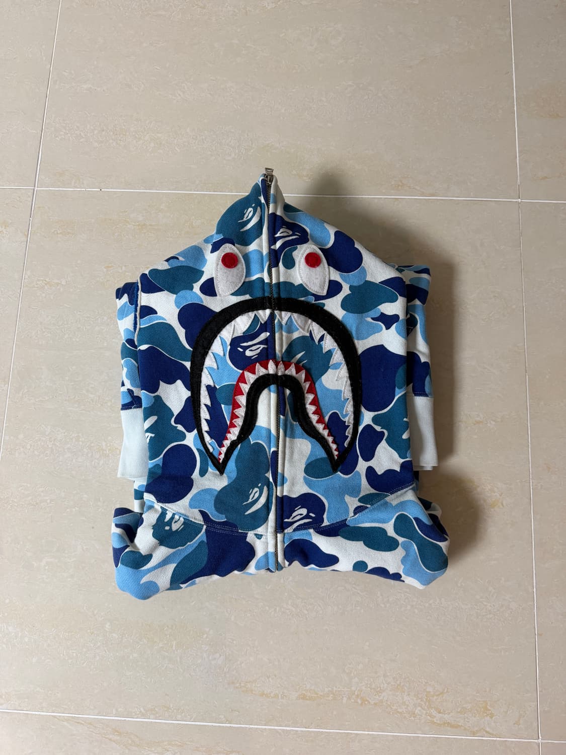 BAPE 블루 카모 샤크후드집업 2XL 사이즈입니다. 인기 많은 블루 카모 패턴이 적용된 제품입니다. 후드 부분의 샤크 디자인이 포인트입니다. 문의 없으시면 바로 안전결제해주시면 됩니다! 정품아닐시 200% 환불 상태 좋아요!