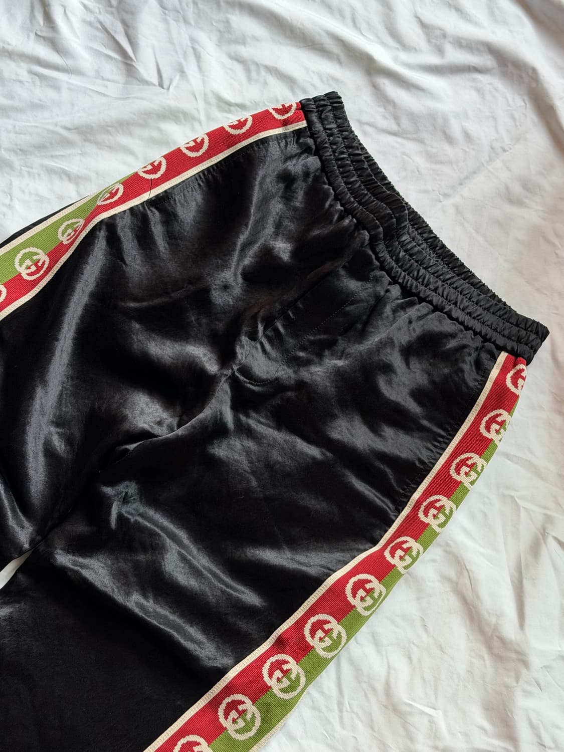 구찌 사이드로고 트랙팬츠 입니다 실크 택스처에 사이드로고가 돋보이는 디자인 이네요 2020년발 국내 신세계 정품택 입니다 상태는 아주 좋습니다 표기 사이즈: 44 허리:밴딩 / 허벅지단면:26 / 총장:89