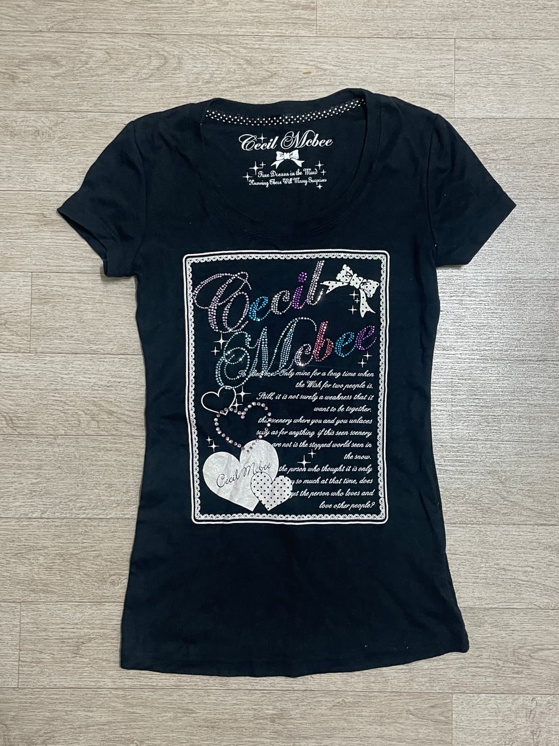 키치하고 화려한 감성이 돋보이는 세실맥비 그래픽 티셔츠입니다. 블랙 바탕에 브랜드 로고와 리본, 하트 디테일이 큐빅/프린팅으로 들어가 있어 포인트가 확실한 디자인이에요. 전체적으로 슬림하게 떨어지는 핏으로 바디라인을 자연스럽게 살려주며, Y2K 무드의 갸루 스타일 코디에 잘 어울리는 아이템입니다.
