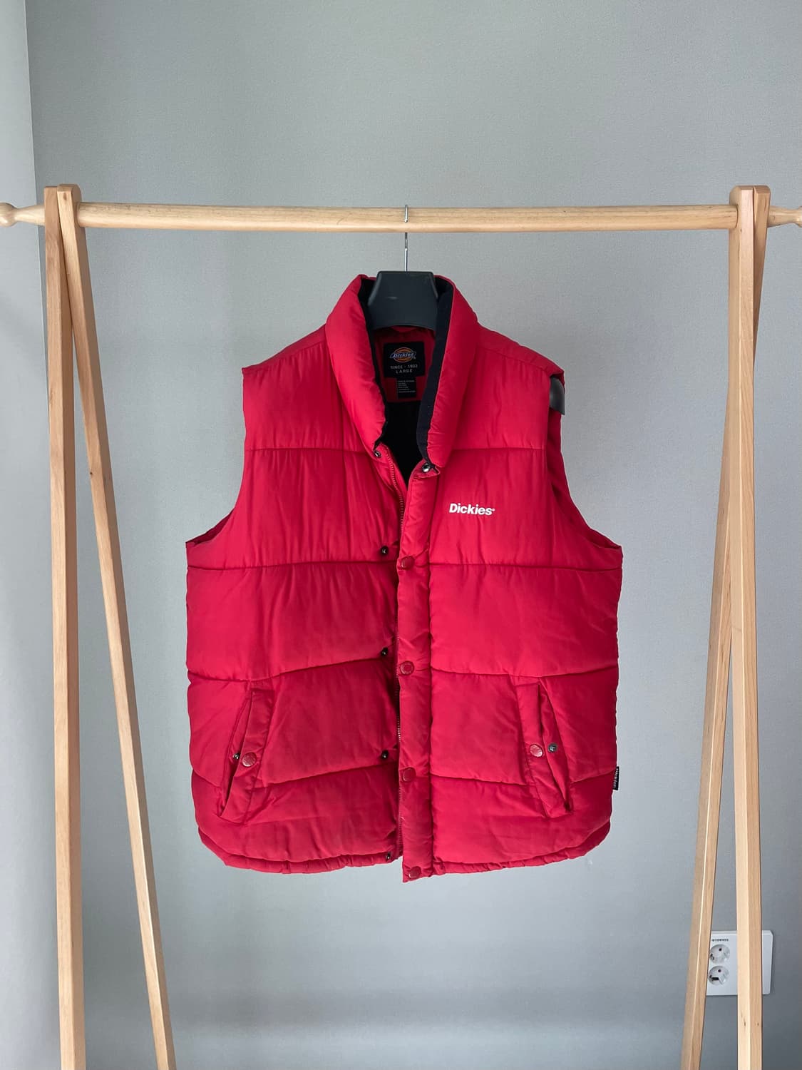 제품명 Dickies 레드 패딩 베스트 사이즈 L 실측 (cm) 어깨 42 / 가슴 58 / 총장 71 제품설명 스냅 버튼과 넉넉한 포켓 디테일로 워크웨어 특유의 분위기가 잘 살아있는 제품이에요. 전체적인 상태는 깔끔한 편이며, 목 부분에 보풀이 약간 있는 정도입니다. 그 외에는 눈에 띄는 사용감 없이 좋은 컨디션을 유지하고 있습니다.
