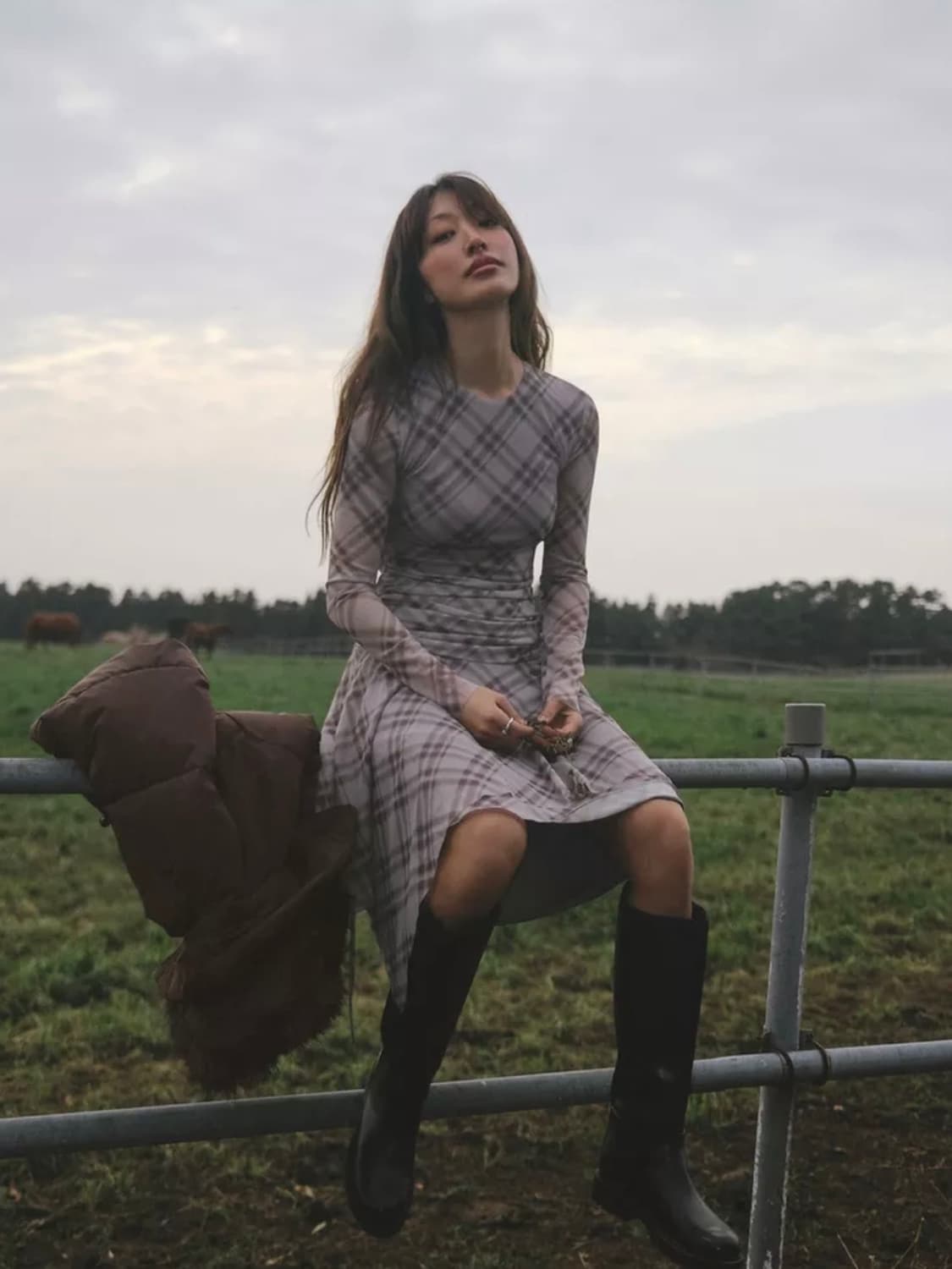 자라 체크 튤 원피스 라일락