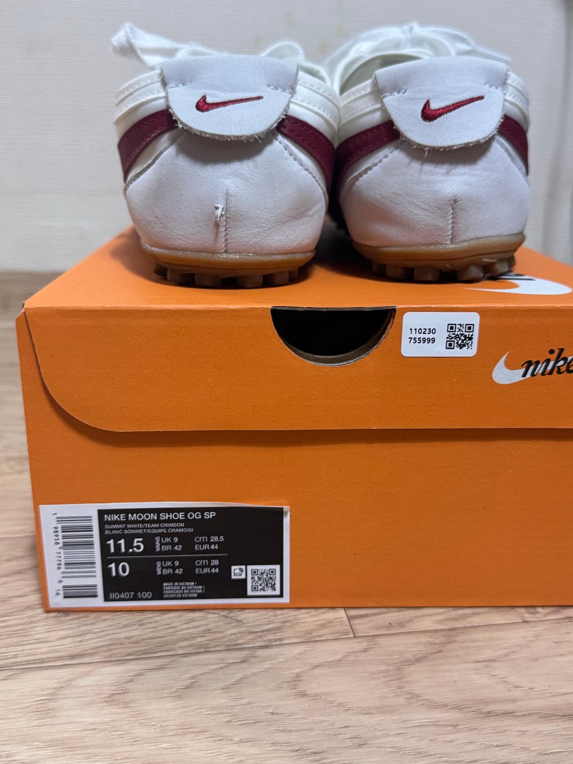 나이키 문슈즈 og 1회실착후 사이즈 미스로 판매합니다11.5사이즈 285cm 이고 사용감또한 사진과 마찬가지로 거의없습니다 네고x 보시고 안전결제 해주시면 빠른배송 하겠습니다