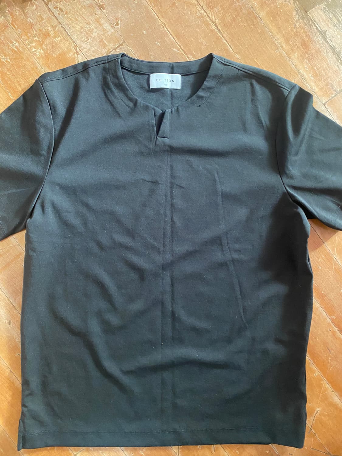 깔끔한 디자인의 에디션 블랙 헨리넥 반팔티 105 사이즈예요 폴리에스터 혼방 소재로 시원하고 편안하게 착용 가능해요 데일리로 입기 좋은 기본 아이템이랍니다 어떤 하의와도 잘 어울려 코디하기 좋아요 실측 가슴 59 총장 71 국내 105 사이즈 추천합니다