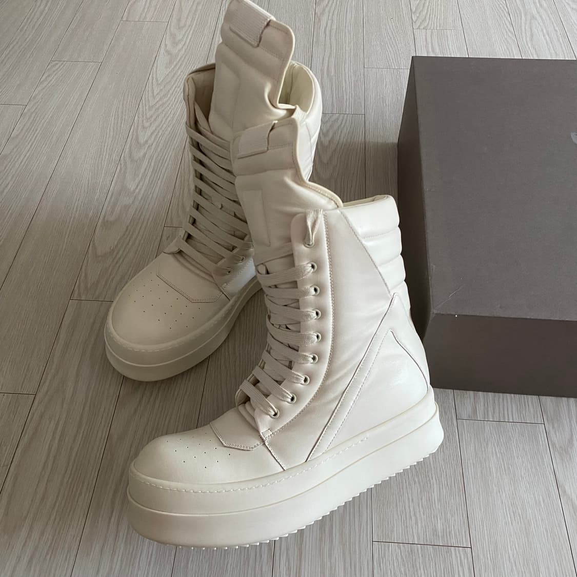 Rick Owens mega geobasket milk Size : 43 릭오웬스 SS25 'Hollywood' 메가 지오바스켓입니다. LCO 송아지 가죽으로 제작됐습니다. 촉촉한 가죽이 일품인 소재입니다. 미시착 풀박스 새상품입니다.