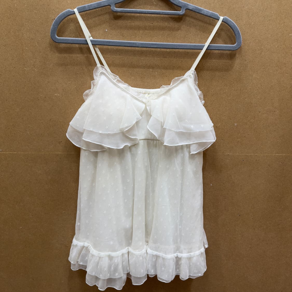 젤라또 피케 슬리브리스 은은한 아이보리 컬러에 입체적인 별 자수가 수놓아진 망사 소재가 덧대어져 있어 굉장히 사랑스러운 스타일 입니다. ​미세한 사용감 외 오염이나 튤 소재 올 풀림 없이 아주 깨끗한 상태 유지 중입니다. ​신축성이 좋아 44부터 정사이즈 55분들까지 예쁘게 착용 가능합니다. #젤라또피케 #gelatopique #빈티지 ✔️사이즈 : F ✔️ 가슴 : 37 ✔️ 총장 : 60 - 실측사이즈는 cm 기준이며 실측은 재는 사람에 따라서 1~3cm 사이즈 오차가 있을 수 있습니다. - 꼼꼼하게 하자 체크 후 미리 알려 드리지만 간혹 작은 이염이 있을 수 있으니 그점 양해 부탁드립니다. - 구제 특성상 교환/환불 불가하오니 신중히 구매 부탁 드립니다.