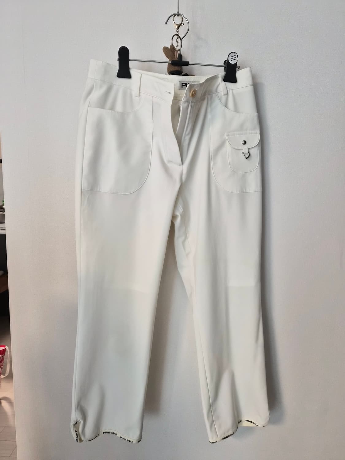 깔끔하고 세련된 디자인의 '핑(PING) 골프' 정품 여성 팬츠입니다. 화사한 화이트 컬러에 밑단의 로고 테이핑 포인트가 들어가 있어, 필드 위에서나 일상에서나 아주 돋보이는 아이템이에요. 핑 골프 특유의 탄탄하면서도 활동성 좋은 소재감으로 착용감이 매우 편안합니다. ✨ 포인트 브랜드: 핑 골프 (PING GOLF) 색상: 깨끗한 화이트 (어디에나 매치하기 쉬운 기본 컬러) 디자인: * 정면의 큼직한 포켓과 왼쪽 작은 플랩 포켓 디테일이 귀여우면서도 실용적입니다. 포켓에 달린 D링에는 거리측정기 케이스나 볼 파우치를 걸기 편리해요. 바지 밑단 안쪽에 'PING GOLF' 로고가 배색 처리되어 있어 롤업해서 입거나 움직일 때 살짝 보이는 포인트가 고급스럽습니다. 핏: 다리가 길어 보이는 깔끔한 스트레이트 핏입니다. 📏 사이즈 정보 표기 사이즈: 55 (S) 추천 사이즈: 평소 정 55 사이즈 입으시는 분들께 예쁘게 잘 맞습니다. 실측사이즈 허단33 총장80