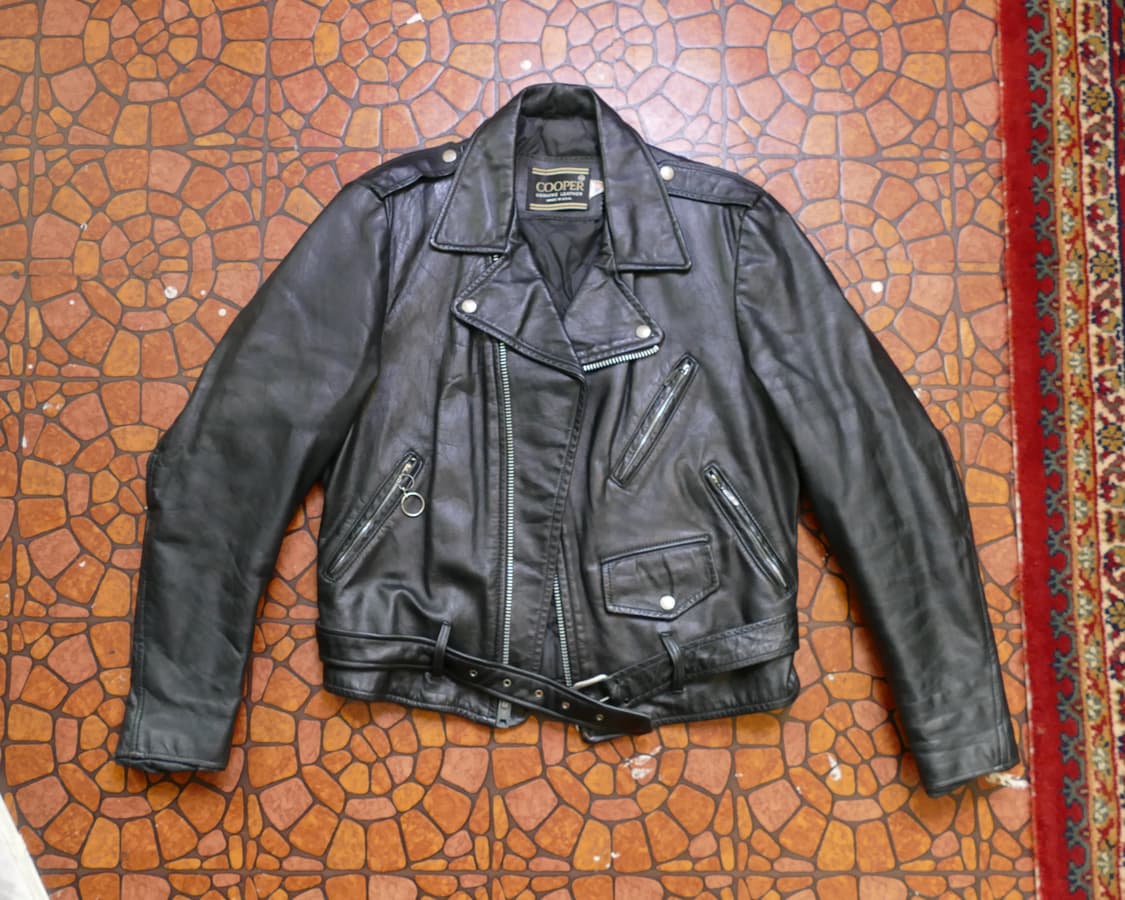 COOPER Genuine Leather Double Riders Jacket (Made in U.S.A.) Made in USA - COOPER Approx size - 40 (L) 가슴55cm 총장65cm 어깨44cm 소매64cm comment 미국산 90년대 미국의 거리와 바람을 품은 정통 더블 라이더 자켓 입니다. 묵직한 블랙 레더와 에이징이 매력적인 COOPER 특유의 실용성과 터프함이 매력적이며 청바지 하나만 걸쳐도 분위기가 완성되는 자켓 으로 추천 합니다.