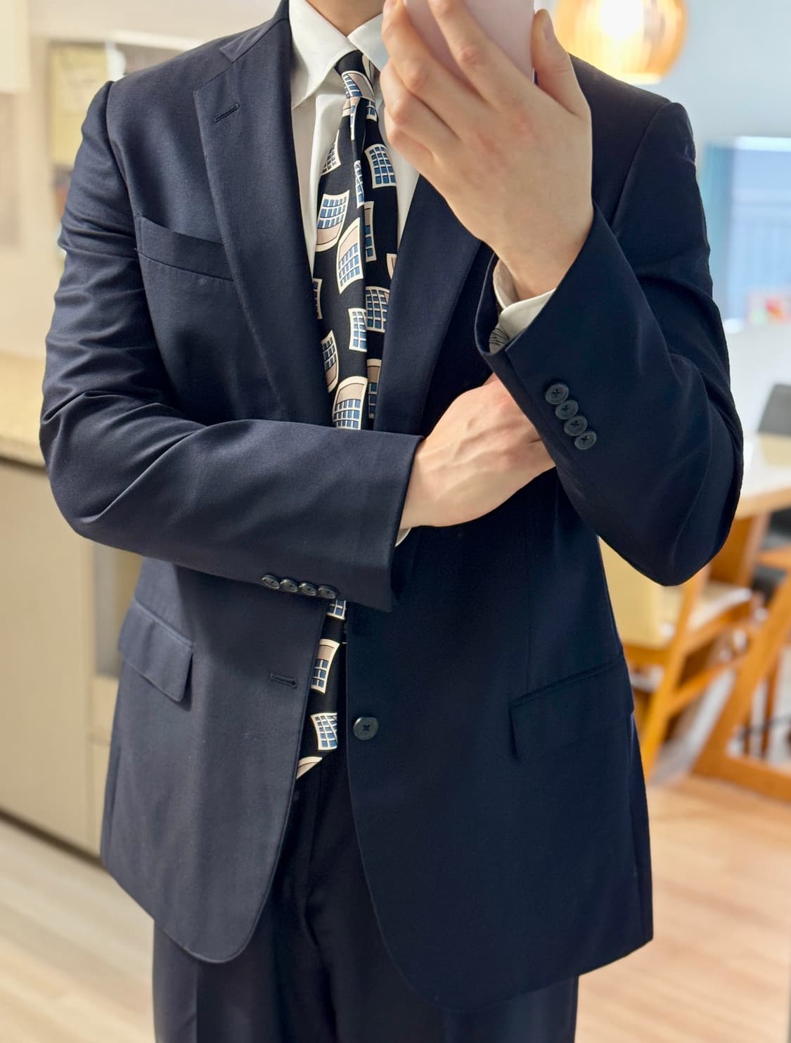 상의 총장 79 품 55 팔 65 하의 총장 105 밑단 22 턴업 5 허리 48 2버튼, 노치드 라펠, 웰트포켓, 자연스럽게 떨어지는 어깨 전형적인 아메리칸 수트입니다. 원단 비탈레 까노니코 입니다. 브룩스의 가장 대중적인 메디슨핏으로 기본기가 탄탄한 제품입니다. 실활용 3회 상태 매우 좋습니다.