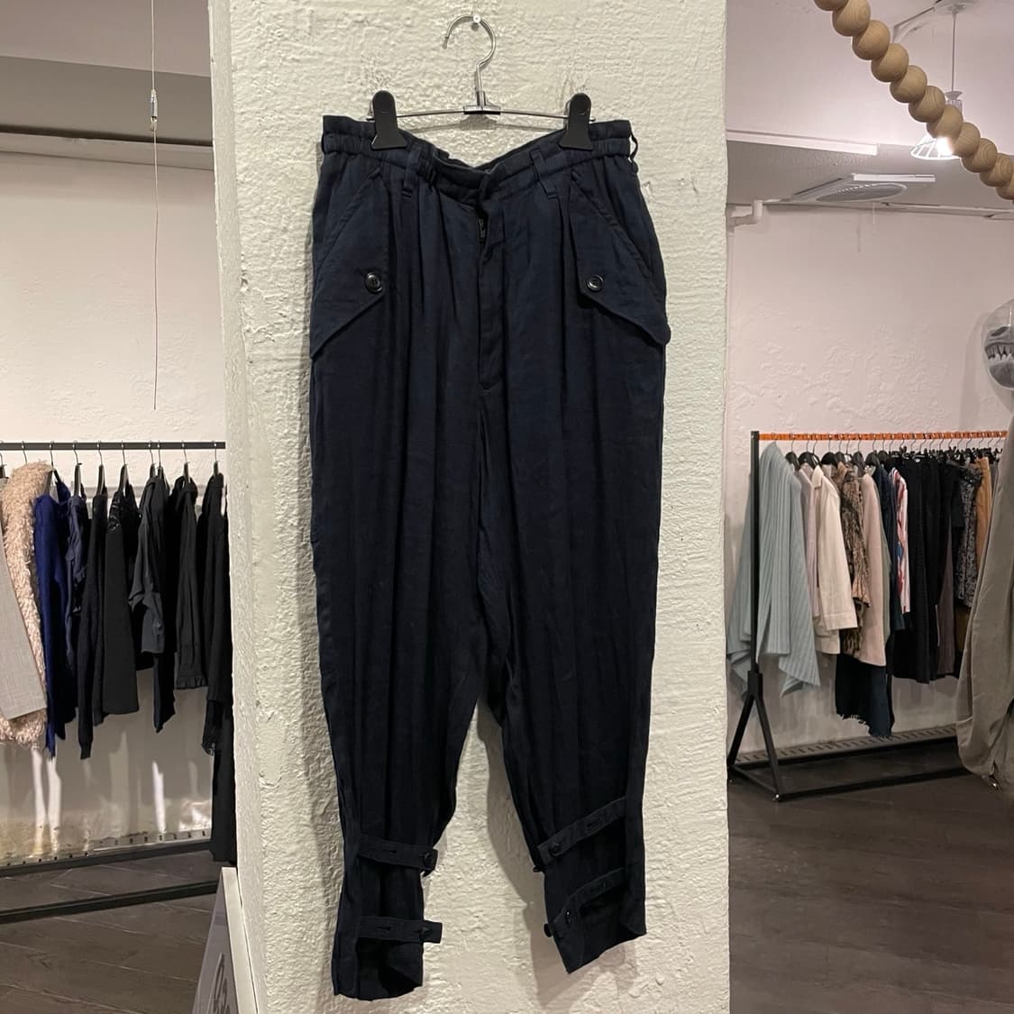 제품 : 요지야마모토 밑단 스트랩 팬츠 사이즈 : 1 (허리37 기장87) 컨디션 : B (약간의 사용감 존재) 설명 : 요지야마모토 블랙 라인의 팬츠로 밑단의 스트랩 디테일이 특징입니다.