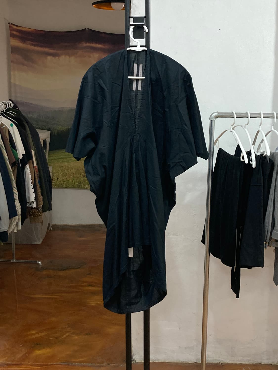 [ 릭오웬스 드레이핑 브이넥 반팔 ] [ Choicer Room 🚪 ] • Info : 릭오웬스 특유의 입체적인 드레이핑 디테일이 돋보이는 브이넥 반팔 셔츠입니다. 블랙 컬러의 세련된 실루엣으로 하이엔드 무드를 연출하기 좋습니다. 메이드 인 이태리 정품입니다. • Size : IT 38 (국내 44~55) (래글런 어깨 디자인) 목라인~소매끝 : 47(cm) 총장 : 95(cm) • Condition : 실사용 5회미만 민트급 📦 Delivery & Benefit 배송비 : 3,500원 (인스타 팔로우 시 무료배송!) 🎁 📍 Notice 모든 문의 및 주문은 DM으로 부탁드립니다.