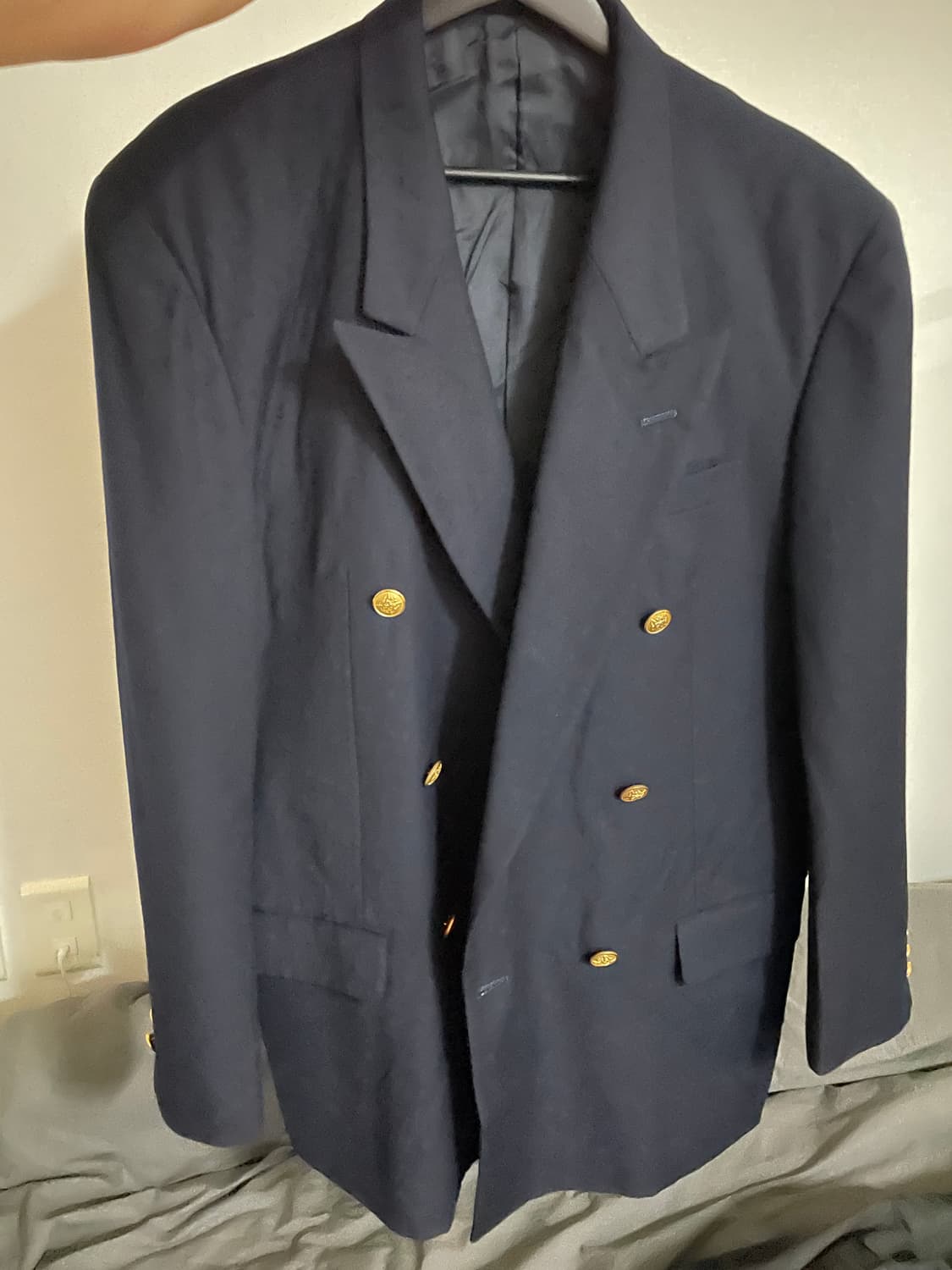 클래식한 매력의 SHARIVE 네이비 금장 더블 블레이저예요 사진에서 보이는 것처럼 금장 단추가 포인트로 들어가 멋스러워요 사이즈 XL(105)쯤으로, 저에게는 커서 한번도 못 입고 매물해요