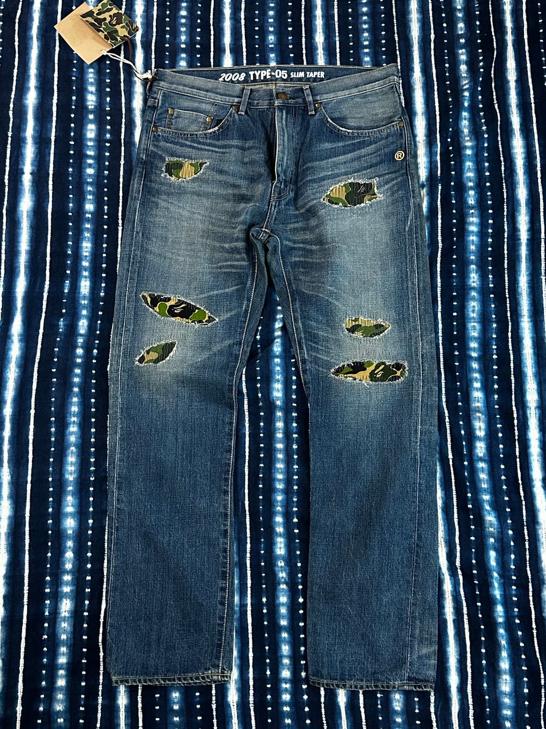 • [XXS,22~23인치] 베이프 카모 패치워크 레더탭 데님 팬츠