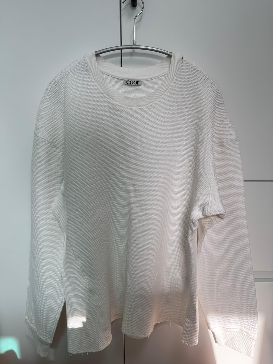 coor 와플 롱슬리브 제품이고 사이즈는 M 입니다. 소매라인과 기장이 비슷해 약간 크롭한 느낌으로 입을 수 있습니다. 어깨쪽 구멍과 밑단쪽 실밥은 원래의 디자인으로 하자가 아닙니다. 또한 관리는 드라이클라이닝만 해서 입었고, 실착은 5회정도 입었습니다. (*중고 거래 특성상 환불은 어렵습니다*)