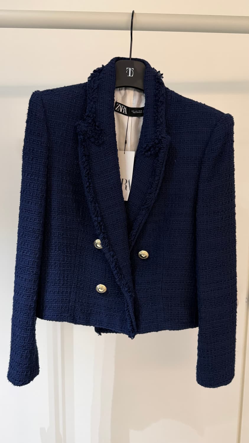 자라 제품이고 네이비색 트위드 자켓입니다. 택도 안뜯고 한번도 안입은 제품이에요 컨디션 너무 좋고 사이즈는 라지에요!