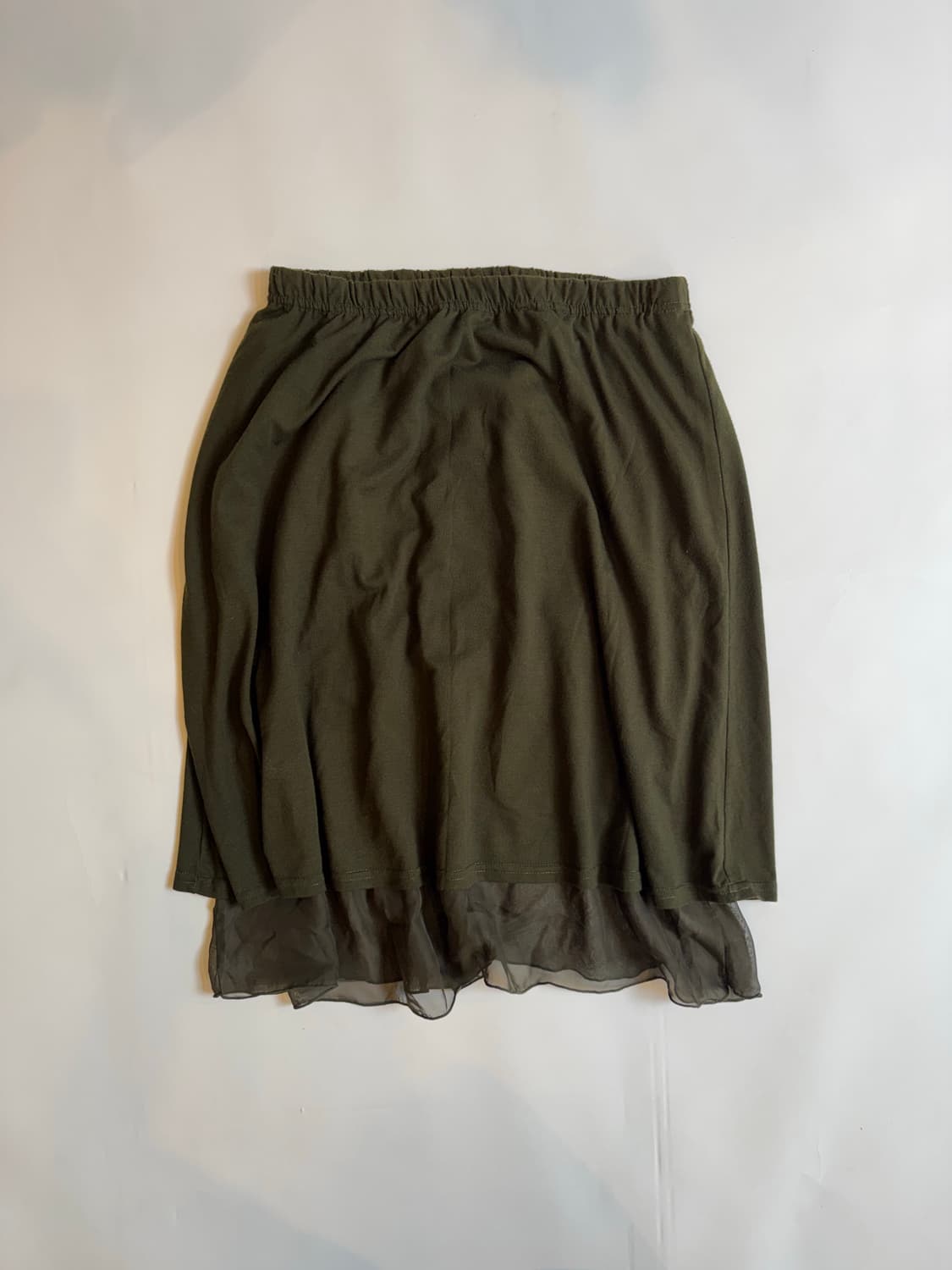올리브 그린 컬러의 차분한 색감이 매력적인 스커트입니다. 하단의 시스루 레이어드 디테일이 유니크하면서도 여성스러운 분위기를 연출해 줍니다. Condition : B+ 교환/환불 관련 상세 내용은 [프로필 공지사항]을 반드시 확인 후 구매 부탁드립니다. 미확인으로 인한 불이익은 책임지기 어려우니 꼭 읽어주세요!