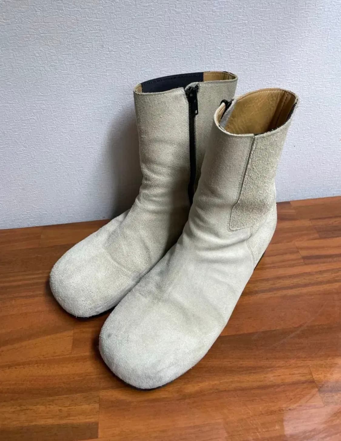 아이보리색 폴리테루 부츠 2사이즈입니다. 265-270정도 사이즈. 옆쪽에 지퍼가 달려있어 신고 벗기 편합니다. 전체적으로 사용감은 있으나, 관리를 잘해서 상태 좋습니다