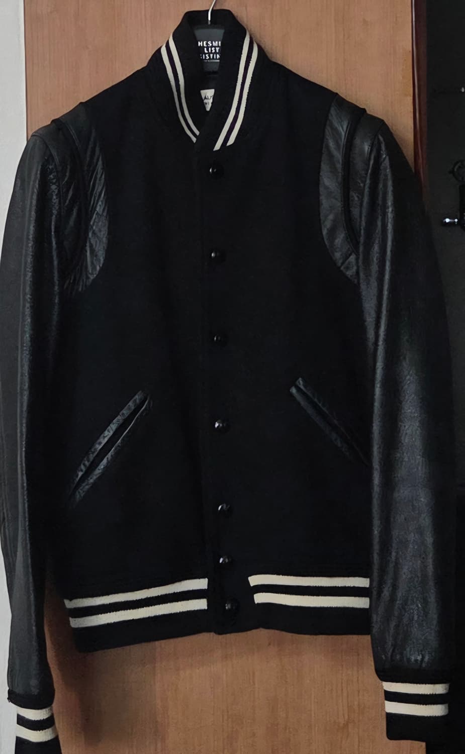 [52] 생로랑 남성 울 레더 클래식 테디 바시티 봄버 자켓 블랙 화이트