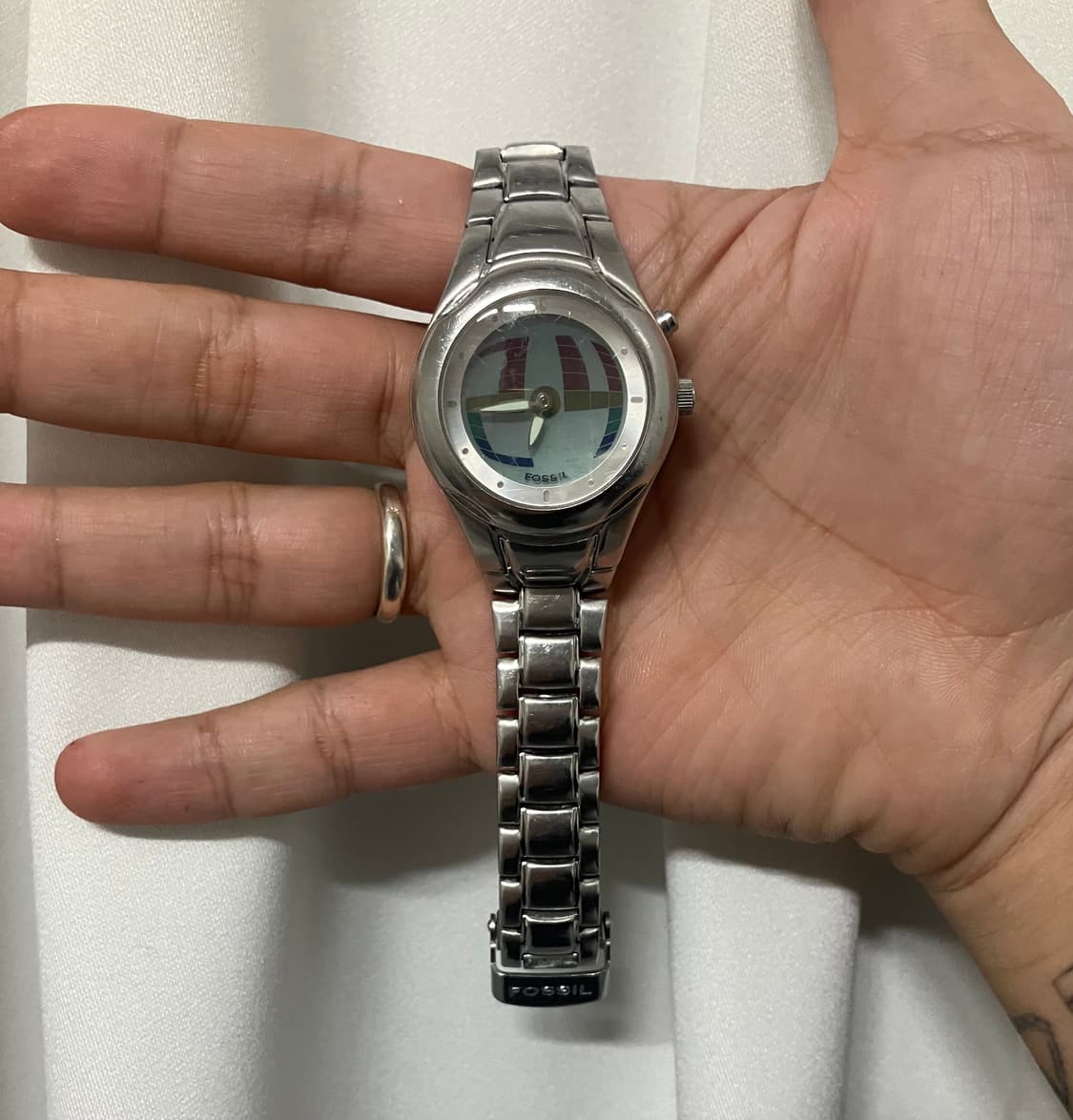 Fossil 파슬 아카이브 Big Tic 빅틱 레인보우 아날로그 문자판 다이얼 뒤에 큼지막한 레인보우 컬러의 디지털 숫자가 시시각각 변화하는 초(R) 를 표시해 주는 독특한 조형의 시계입니다. ( 위에 버튼 누르면 초가 변하는 패턴이 바뀝니다.) 빅틱(BIG TIC) 은 1999년도 부터 00년대 초반 짧은 기간만 발매 되었는데도 매니아층이 있는 파슬의 대표 시계라 생각합니다. 점점 매물은 사라지고 있어 구하기 어려운 시계입니다.! 빈티지제품으로 기스 및 생활감있습니다 민감한분은 구매를 삼가해주세요 빈티지 제품으로 환불 불가하오니 신중한 구매 부탁드립니다.