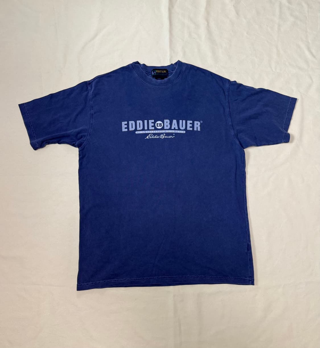 90s EBTEK (Eddie Bauer) Logo T-shirt Condition: 8.5/10 (90s 텍스처 특유의 기분 좋은 피그먼트 워싱감이 돋보이는 상태입니다. 자연스러운 물빠짐 외 데미지 없는 우수한 컨디션 유지 중입니다) Size: L/G (Made in USA) • Shoulder: 53 • Chest: 61 • Length: 77.5 요즘은 치카노 스타일처럼 화려하고 기교가 섞인 필기체 폰트들이 많이 유행하죠. 유행이라는 게 늘 그렇듯 모두가 한 방향을 바라볼 때, 저는 이 투박한 90년대 볼드체 로고에 마음이 갑니다. (절대 다른 폰트들이 멋있지 않은건 아니에요) 괜한 반항심일 수도 있겠지만, 정직하게 자기주장을 펼치는 이 폰트에서 느껴지는 당당한 에너지가 참 좋거든요.. 그 시대의 건강함이 로고 폰트 하나에 고스란히 담겨있는 것 같거든요. (뭐 그냥 여러가지를 입으면 좋잖아요 :)) 미국에서 생산된 90년대 에디 바우어(Eddie Bauer)의 스포츠 라인인 'EBTEK' 제품입니다. 아주 짧은 기간만 생산이 됐다고 해요. 세월을 머금으며 자연스럽게 바랜 블루 컬러의 피그먼트 워싱 질감이 이 투박한 볼드 로고와 만나, 레트로한 무드를 자연스럽게 보여주는 듯합니다. 문의 없으시면 바로 안전결제 해주세요. 빈티지 특성상 완벽주의자에게 추천하지 않습니다.
