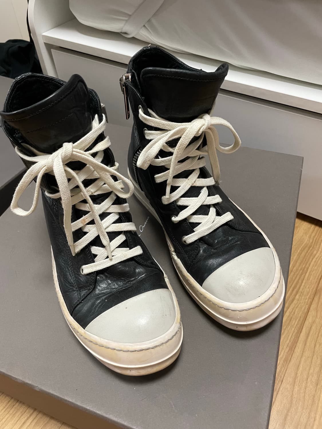 릭오웬스 스니커즈 37사이즈 가죽버전이며 굉장히 깨끗한 상태 유지중이오나 아웃솔에 크랙이 갔습니다 수선집에 문의해본 결과 16만원에 양쪽 다 교체가 가능하다고 합니다. 그 이외에 상태는 너무멀쩡합니다 상자 검정끈까지 포함 네고 x