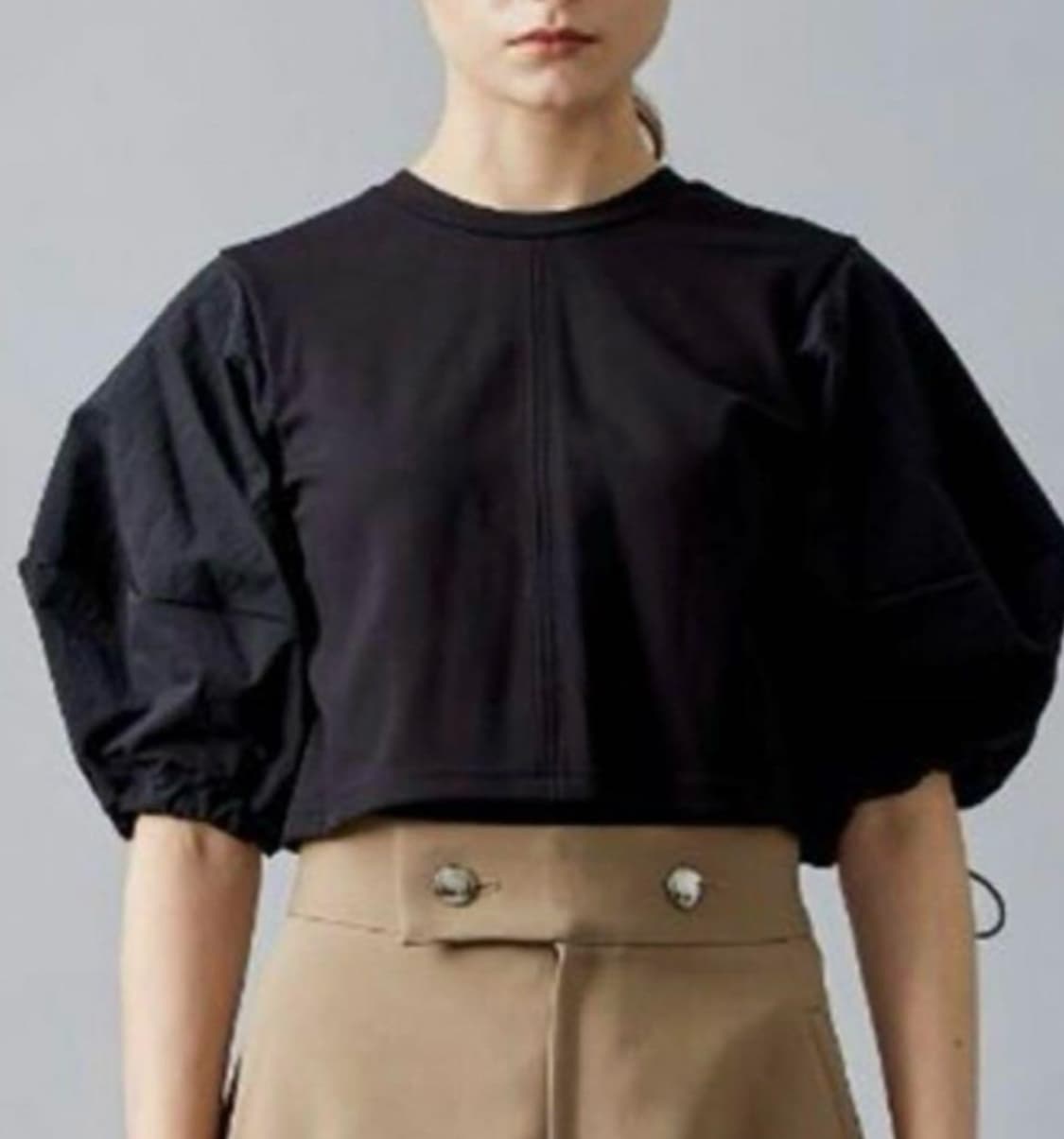 Un3d 크롭티입시다.뒷지퍼. 퍼프부분은 힘있는 폴리소재고 몸통부분은 면입니다. 택제거하고 시착만 했습니다. 정가20만원 넘었던걸로 기억합니다. 38사이즈 블랙.