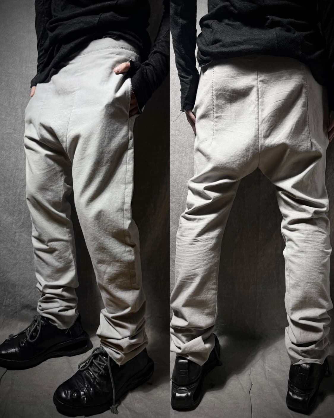 이탈리아 장인 정신을 바탕으로 가공되지 않은 거친 질감과 아방가르드한 빈티지 미학을 전개합니다. SS12 컬렉션의 코튼 팬츠로 허리단과 포켓 라인을 따라 정교하게 노출된 오버록 스티치가 공예적인 디테일을 강조합니다. 드라이한 질감의 100% 코튼 소재를 사용하였으며 로우 엣지 마감과 여유로운 실루엣이 조화를 이루어 브랜드 특유의 정제되지 않은 감각을 완성합니다.