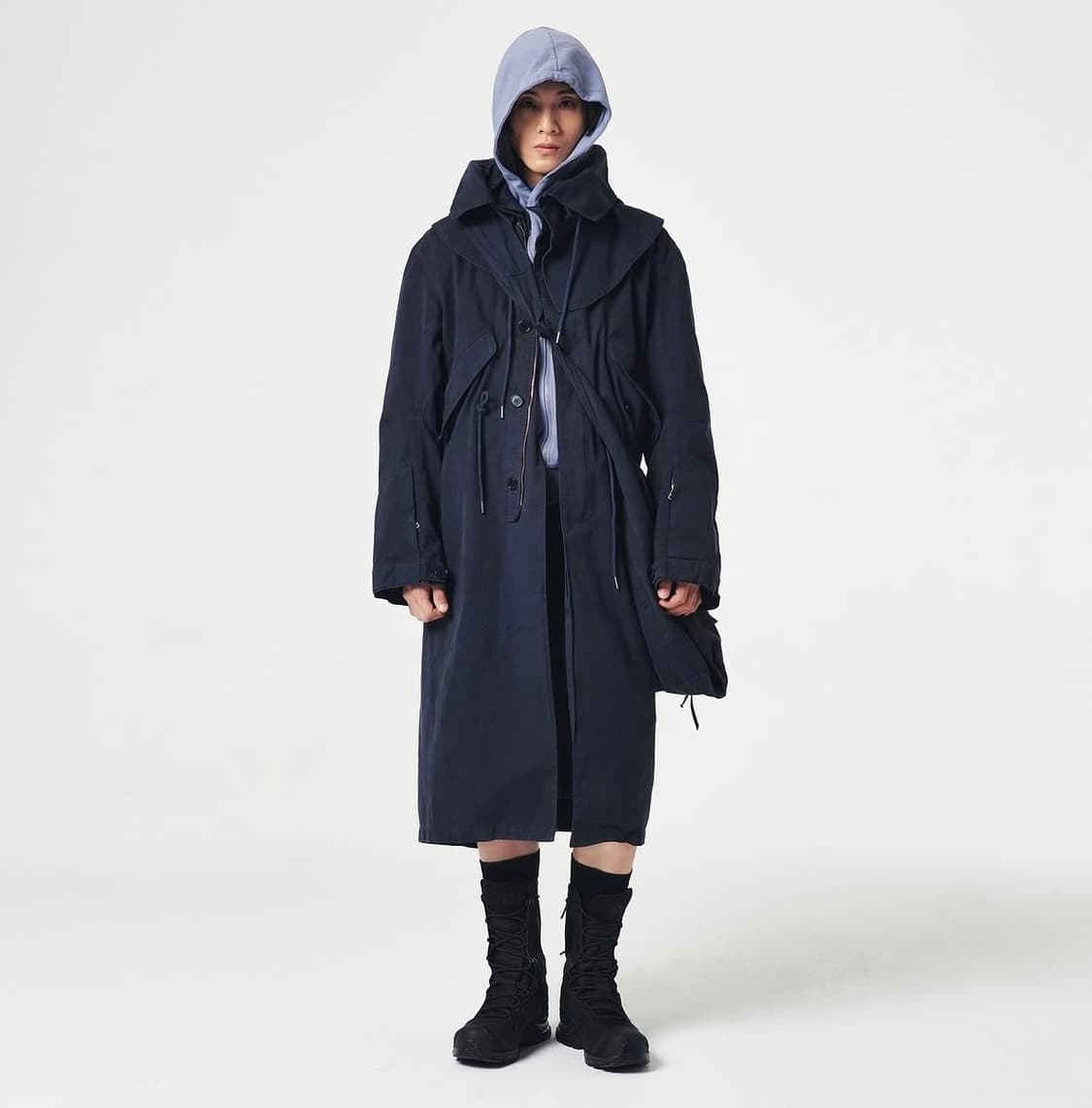 • 누마레 이이 EE 가먼트 다잉 커브드 피쉬테일 코트 카키