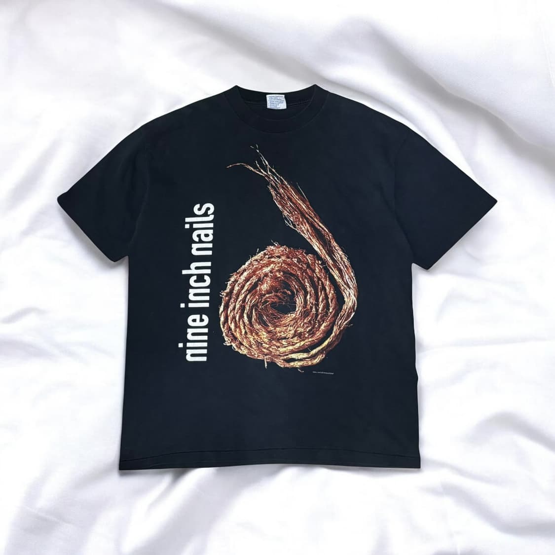 1995 Nine Inch Nails “Further Down The Spiral” T-shirt 나인 인치 네일스의 Further Down The Spiral 프린팅 티셔츠입니다. 전면에는 강한 인상의 스파이럴 그래픽과 nine inch nails 로고가 들어가 있으며, 후면에는 NIN 로고 / 1995 / further down the spiral 프린팅이 배치된 개체입니다. 블랙 바디 위로 들어간 대비감 강한 화이트 프린팅과 아트워크가 인상적이며, 90년대 얼터너티브/인더스트리얼 무드가 잘 살아있는 제품입니다. 앞뒤 모두 확실한 포인트가 있는 디자인으로, 컬렉션용은 물론 실착용으로도 만족도 높은 티셔츠입니다. Size : XL (어깨 58.5 가슴 62 총장 79.5 소매 24.5 cm) Price : 1,500,000