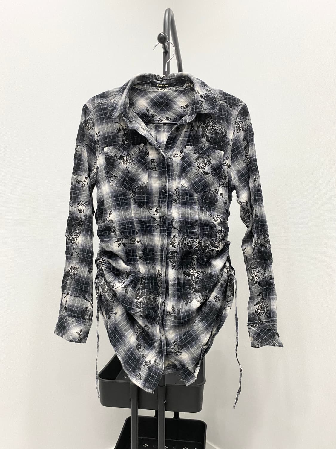 Overprint Side-Shirring Long Shirt 90년대 후반에서 2000년대 초반, 일본의 폰즈 패션과 고딕, 락시크 무드를 주도했던 토네이도 마트 사의 셔링 셔츠 입니다. 양옆의 드로우스트링을 통해 기장과 셔링을 조절할 수 있으며, 타탄체크 베이스 위에 장미문양이 오버프린트 된 제품 입니다.