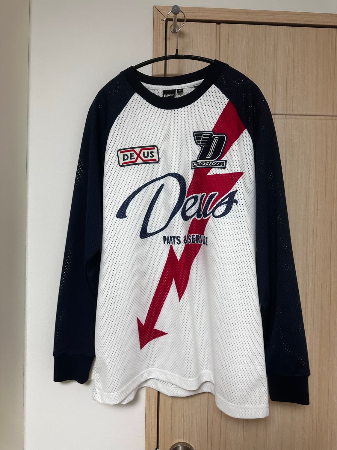 데우스 모터 저지 긴팔티 XL사이즈 판매합니다. 흰색 메쉬 소재에 검정색 팔이 포인트입니다. 데우스 로고가 크게 박혀있어 이쁩니다. 문의 없으시면 바로 안전결제해주시면 됩니다! 기장 76 가슴 60