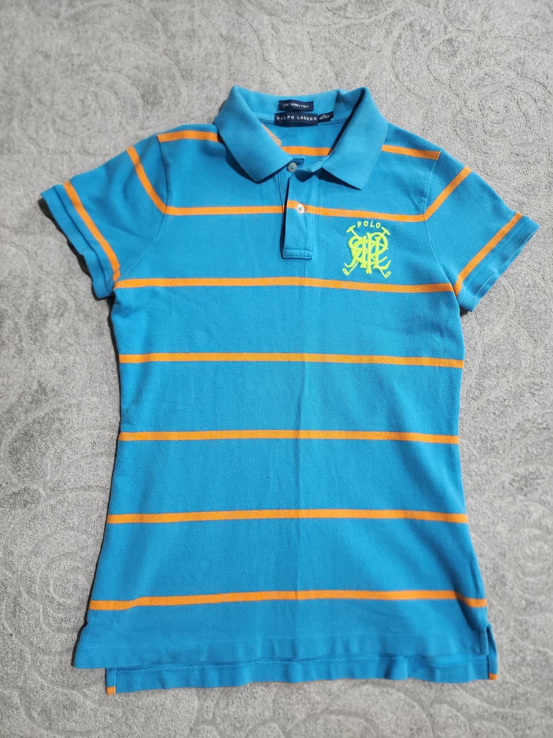*폴로 랄프 로렌 피케 셔츠 M(165/92A) 선명한 블루 컬러에 오렌지 스트라이프가 대비되어 굉장히 스포티하고 경쾌한 느낌을 줍니다. 가슴 부분의 옐로우 Polo PRL 자수 로고가 빈티지하면서도 고급스러운 포인트가 됩니다 M(165/92A) 사이즈는 보통 여성 정 90~95 사이즈에 해당하며, 스키니 핏 특성상 몸매 라인을 예쁘게 잡아줍니다 2.
