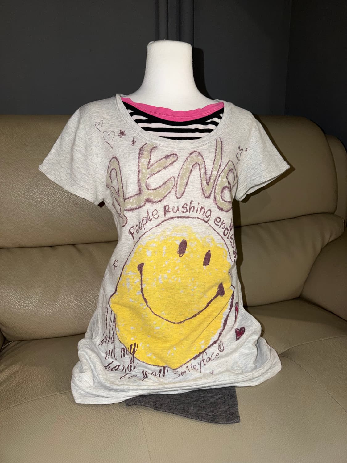 •3-layered smile point printing tee •size: cm 39 45 73(어깨 가슴 총장) •price: 38000 -총 삼중으로 레이어된 디자인에 스마일이 넘 귀야운 탑 -카와이한 레터링과 프린팅이 결합된 디자인으로 포인트로 착용하기 좋은 제품이랍니다 -사이드에 포켓두 있어서 골반라인 커버되는 핏감으로 떨어집니다 ㅎㅎ 핏도 쪼아용