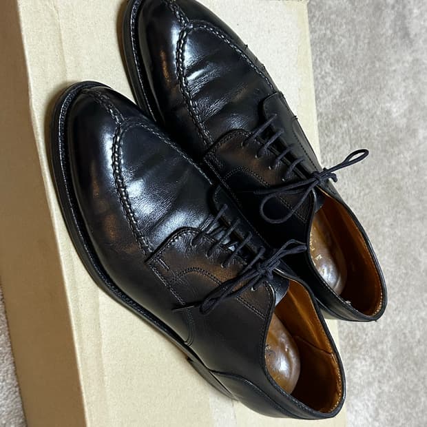 Alden ······ #알든 社의 1273S 스웨이드 처카부츠 다크브라운 입니다. 배리 라스트의 #알든1273S 개인적으로 알든에서 가장 편한 라스트인 Barrie Last가 적용된 모델. 더불어 굿이어웰트, 그리고 여타 다른 아웃솔에 비해 월등한 내구성을 자랑하는 Lug Rubber Outsoles 이 적용되어 눈,비와 같은 환경조건 유리하며 오랜시간 함께할 수 있는 장점도 참고하시면 좋을 것 같습니다. 배리라스트, 러버아웃솔 등 종합적인 구조가 날씨와 같은 외부의 영향에 신경쓰지 않고 전천후 편하게 막 신기 좋은 처카부츠 입니다! ······ - Alden 1273S Suede Chukka Boot - Size : 8.5D [Barrie Last / 추천사이즈 265] - Condition : 8/10 [신발 단품] - Price : 35.2 ······ - Item Code 1046
