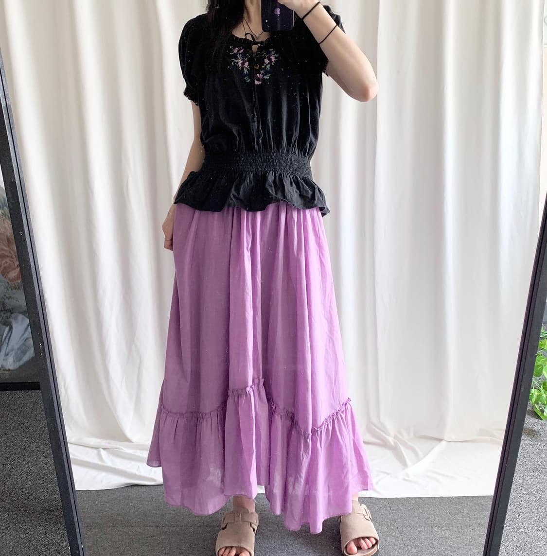 ••• black puple embroidery blouse ••• 검정 베이스에 보라색으로 자수 디테일이 들어간 블라우스입니다! 요거 너무 귀엽지 않나요?! 🥺🖤 색 조합도 넘 예쁘구 무엇보다 핏이 진짜..... 완전 말라보이는 핏이었습니닷.... 넥라인이 파져있어서 정말 여리여리해보이는 핏이었어요 🥺💖 오프숄더까지는 안 되구요! 밑에 밴딩 있어서 원하시는 기장감으로 조절 가능하답니닷 🥰 요거두 빈티지 입문자 분들께도 추천드릴 수 있을 정도로 무난하면서도 빈티지하고 예쁘답니닷 추천드려요! 30,000 krw ••• purple pink long skirt ••• 언발란스한 기장감의 롱스커트입니다! 보라색인데 약간 핑크계열 보라색이라고 생각하시면 될 것 같아요 💗 오묘하고 흔치 않은 색감의 스커트라 정말 예쁘답니닷... 🍇😘 저는 보라 자수 블라우스와 코디해주었지만 사실 흰색 등 다양한 색상의 탑과 조합해주기 좋아요! 아름다운 색감에 비대칭적인 밑단 포인트로 정말 예쁜 제품입니닷 추천드려요...💗 36,000 krw blouse + skirt = 66,000 -> 60,000
