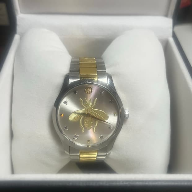 구찌 뱅글 메탈 시계(정품) 3년전 선물받은제품이구요! 130만원 정도 하는제품이며 블루자개액정입니다. 쇼핑백+ 시계 책자보증서 + 시계박스 모두있구요 시계 보호필름도있습니다! 상태 아주좋아요! 애플워치를 자주차서 착용을 안해서 판매해용 -현재 시계멈춘상태로 시계배터리 교체하셔야해요!(시계방가면 교체가능합니다,교체하시면 이상없는제품이며 얼마전까지 이상없는부분확인함) (배터리 값 빼서 올렸습니다!) -손목이 얇아서 제 손목에 맞게 줄여놓은 상태이구요, 이부분도 시계방가면 수선 가능하세요! 착용사진원하시면 보내드릴게요