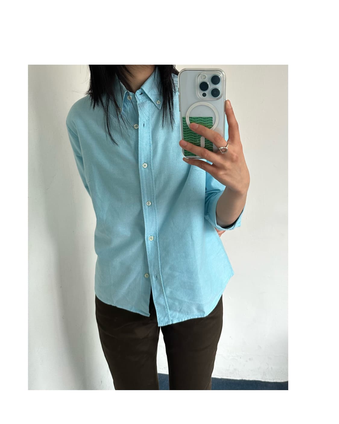 Benetton short shirt •color : blue • size : os • fabric : 코튼 100% • 실측 : 어깨 40 팔 43 가슴 53 총장 59 • 부드럽고 탄탄한 코튼 소재감 • 청량하고 화사한 블루컬러감 • 숏한 기장감의 셔츠로 하의와의 매치가 수월합니다 :) • model spec : 165 / 51